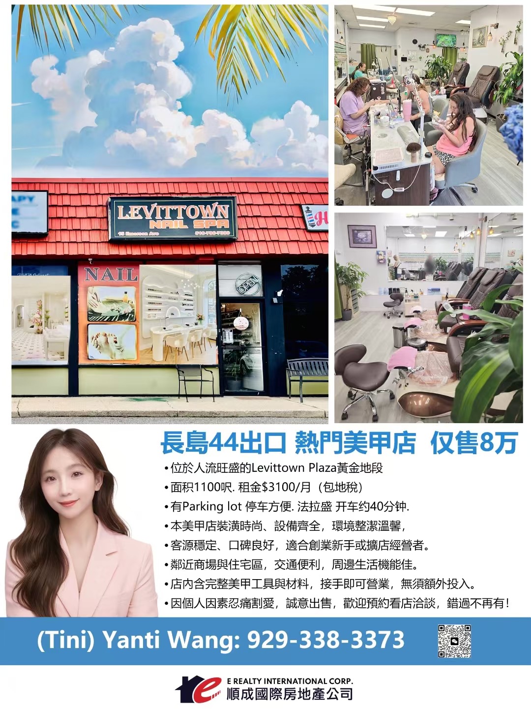 买家经纪佣金6%👏🏻欢迎合作👏🏻新上市🥇長島44出口 熱門美甲店 仅售8万✨🥳位於人流旺盛的Levittown Plaza黃金地段🎉💅面积1100呎. 租金$3100/月(包地稅)🚗有Parking lot 停车方便. 法拉盛 开车约40分钟.💎本美甲店裝潢時尚、設備齊全,環境整潔溫馨,客源穩定、口碑良好,適合創業新手或擴店經營者。🛍️鄰近商場與住宅區,交通便利,周邊生活機能佳。
