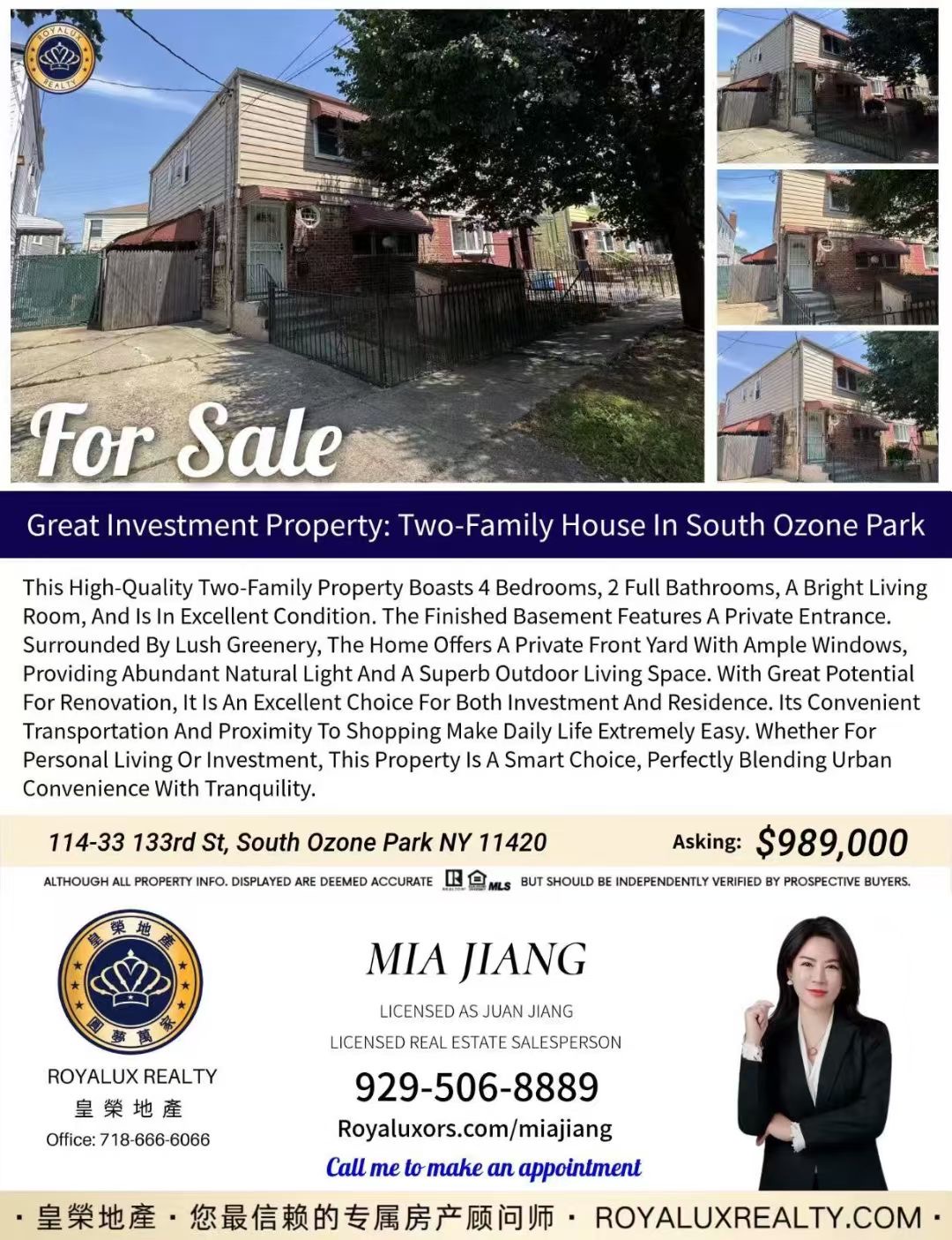 皇后区房子出售🎖️近法拉盛单边投资好房2家庭出售售价:98.9w🎖️房子介绍:近法拉盛,这栋2家庭的优质房产拥有4个房间,2个全浴,客厅敞亮,维护状况良好,完成地下室有独立出入。房产周围翠绿环绕,私人前院明亮多窗,为居住者提供了充足的自然光线和绝佳的户外生活空间。房产改造潜力大,是投资与居住两相宜的绝佳选择。其交通便利,购物出行方便,使日常生活极为便利。这处房产无论对于自住还是投资,都是智慧之选,坐享繁华与宁静的完美结合。📍地址:114-33 133rd St, South Ozone Park NY 11420📲约看请联系负责经纪: