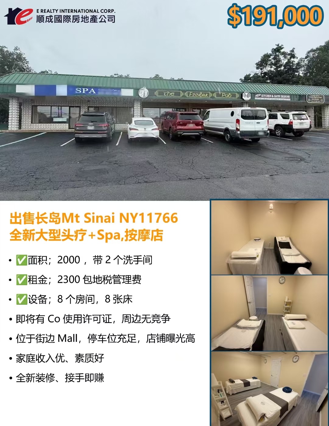 特改装按摩SPA(诚意买家可谈,Co 以批)🆕出售长岛Mt Sinai NY11766全新大型头疗+Spa,按摩店mls#896544售价;191,000✅面积;2000 ,带2个洗手间