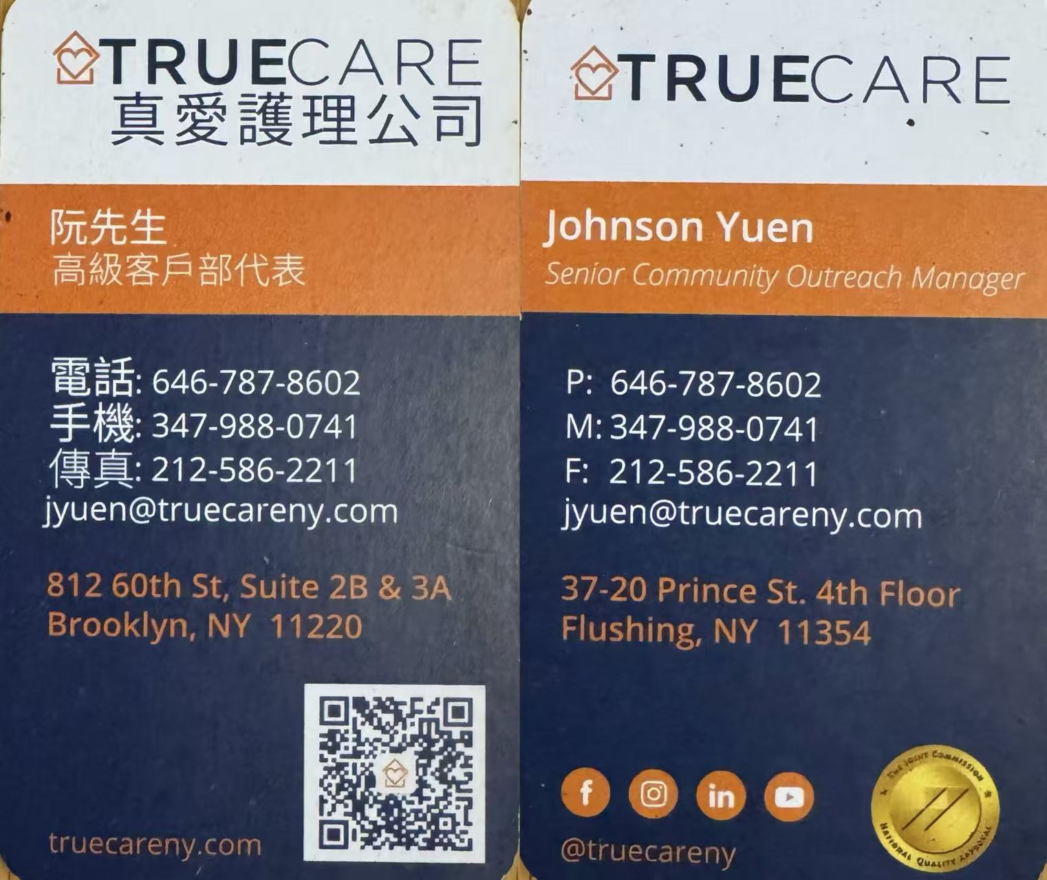 真爱护理公司(TRUECARE) 是纽约华人社区首屈一指的家庭护理服务提供商,致力于为居民提供个性化、专业、可靠的护理解决方案。无论是日常生活协助、医疗护理、还是康复治疗,TRUECARE 都能根据客户需求定制方案。