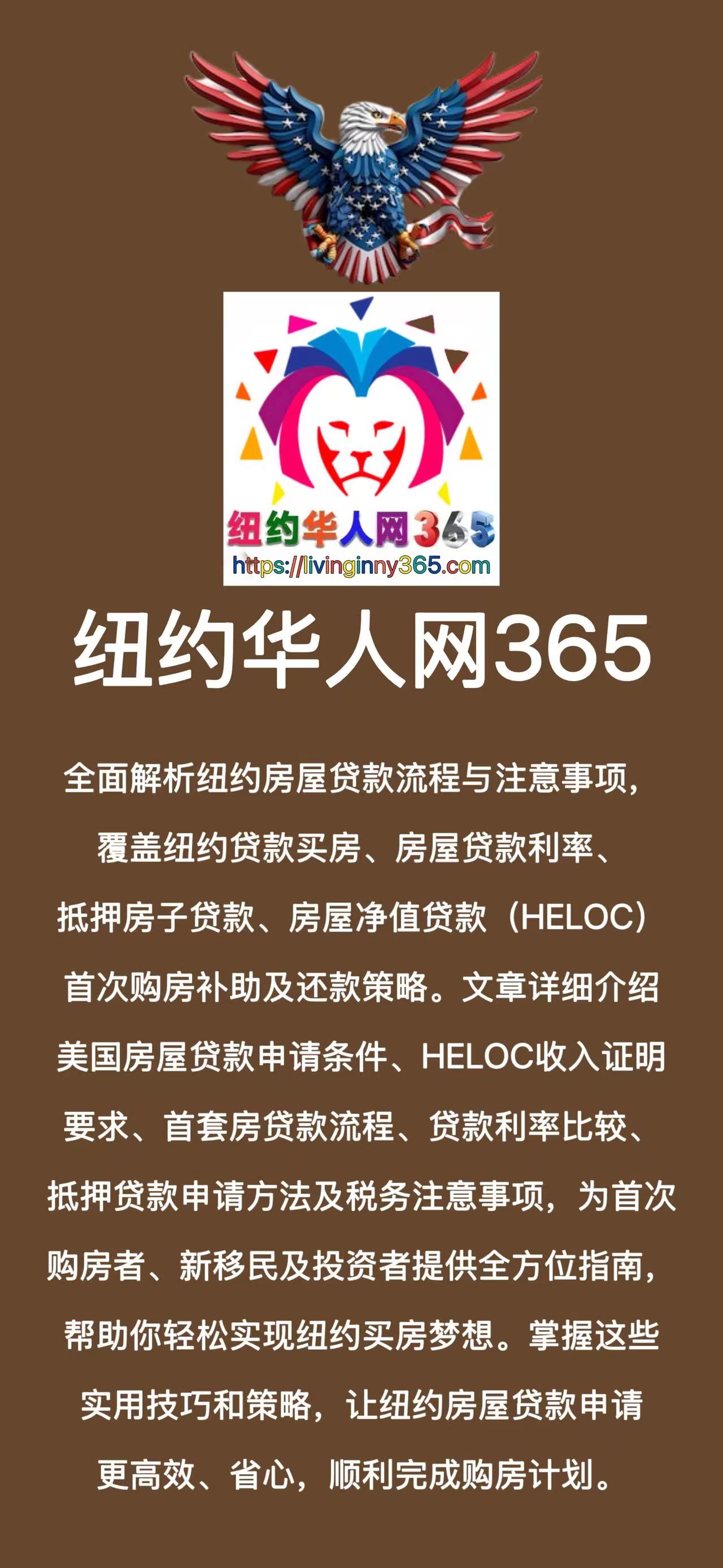 美国房屋贷款全攻略:流程、利率、补助与实用案例详解。全面解析纽约房屋贷款流程、利率选择、首付补助及房屋净值贷款(HELOC)。了解纽约贷款买房注意事项、抵押房子贷款方法、首次购房补助及还款策略,助你轻松实现纽约买房梦想。适合首次购房者、投资者及新移民参考。掌握纽约房屋贷款全流程,从贷款申请、利率比较、房屋净值贷款(HELOC)、抵押贷款到政府补助政策和还款优化。提供实用案例与策略,让纽约贷款买房更高效、省心,帮你顺利完成购房计划。