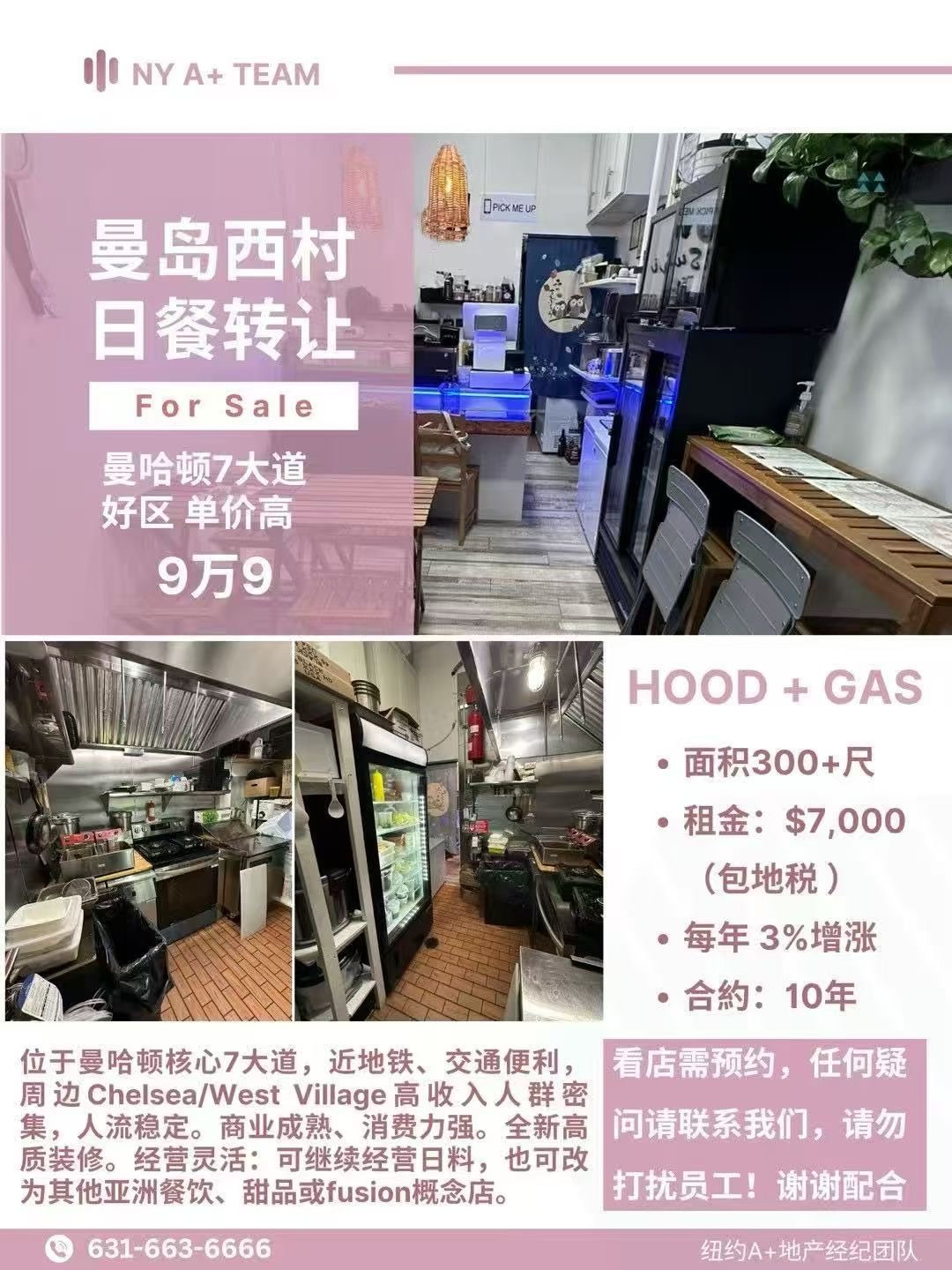 周日9:30PM看店👀曼哈顿日餐转让 7大道~ 好区。单价高~全新装修hood+gaslease有10年 每年3% 房租7000包地税,欢迎约看店631-663-6666