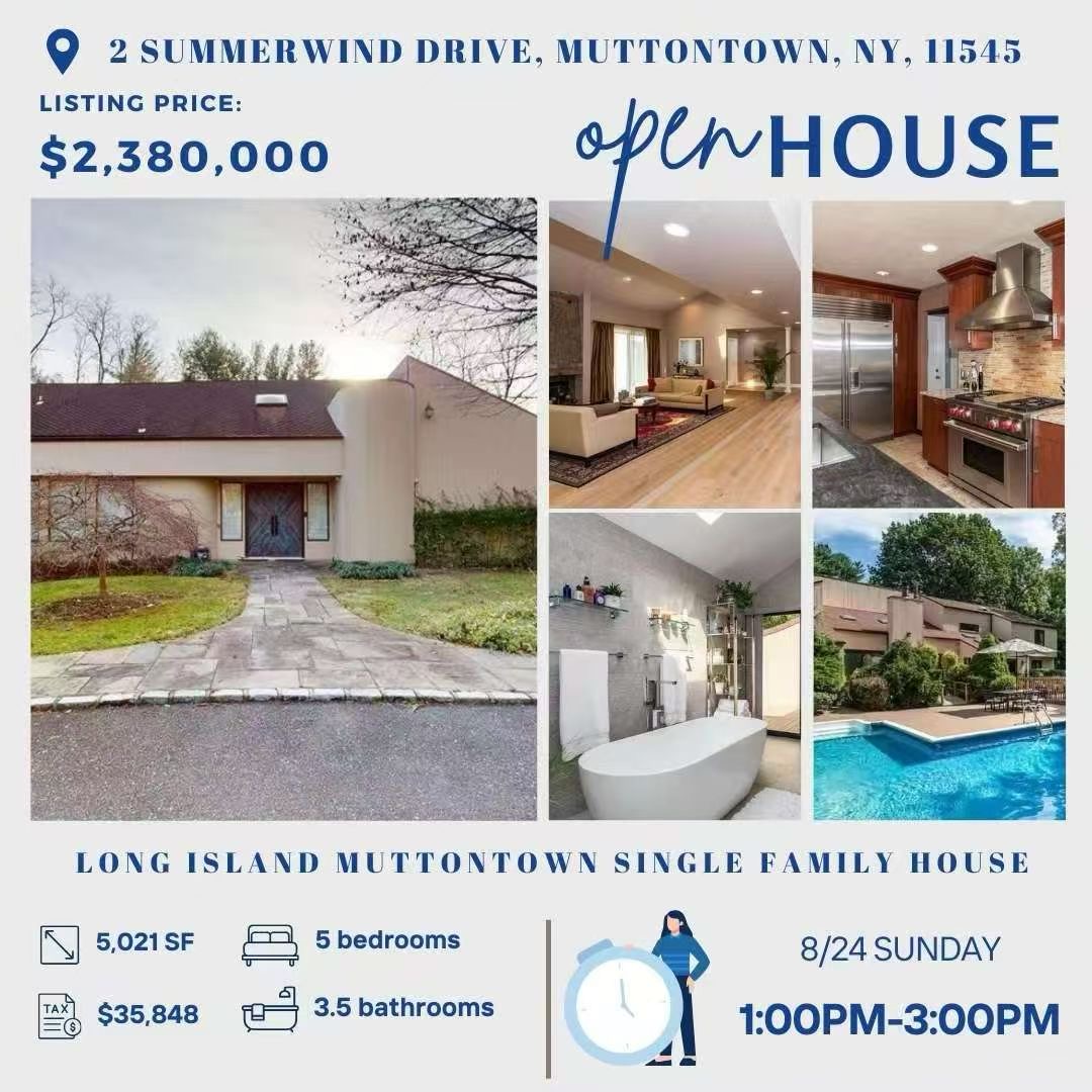 🆘 急售 ✅ 售價調整 $238萬🎈 〖周日公展〗 8/24,下午 1:00 到 3:00pm🎈長島現代風豪華一家庭出售🔥📍2 Summer Wind Drive, Muttontown, NY 11545 🔹現代豪華一家庭,佔地 2 英畝