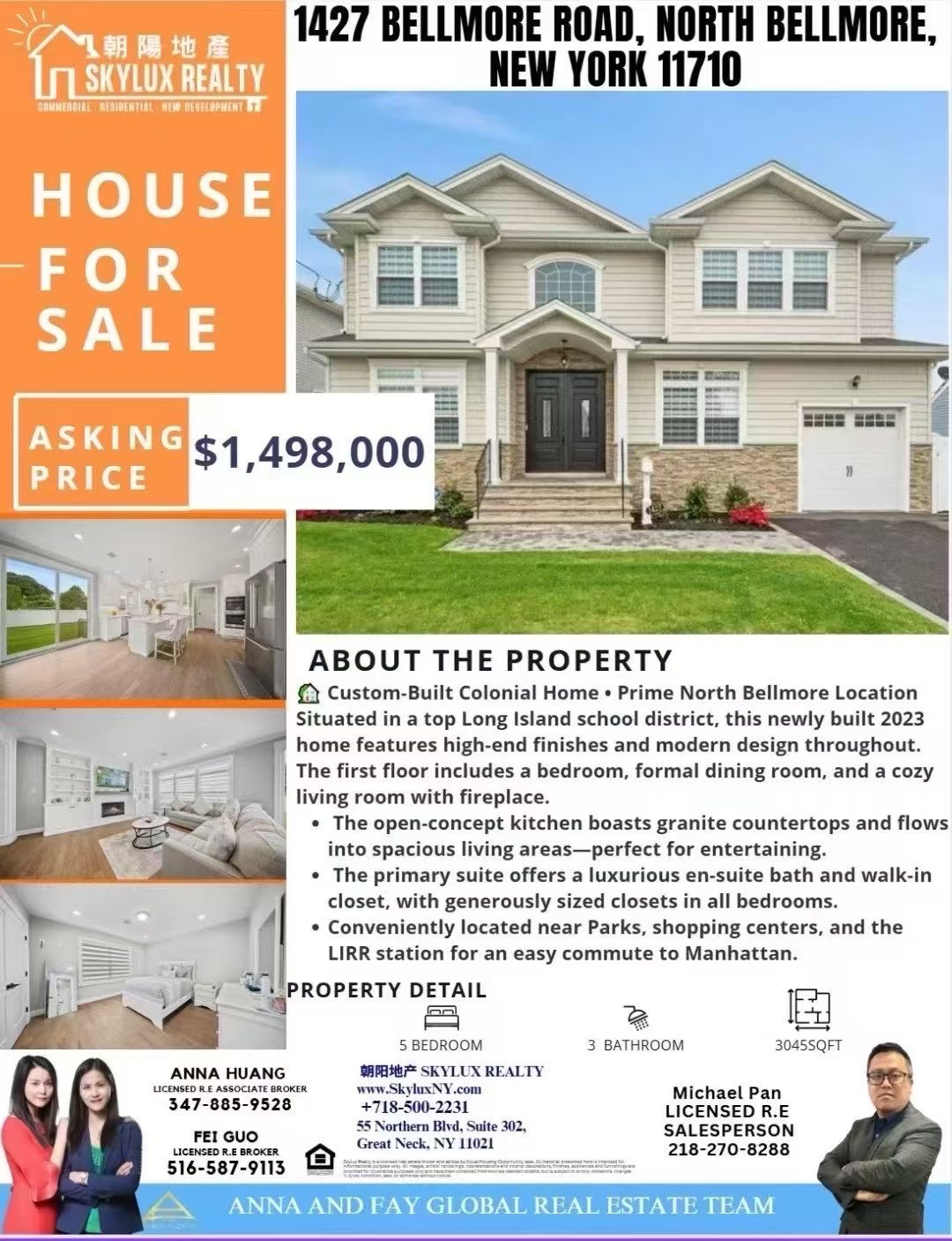 长岛新上市 2023年定制建造殖民地 风格住宅,售$149.8萬坐落于North Bellmore黄金地段,隶属于长岛顶级学区! 这是一套精美设计的定制住宅,拥有5间卧室、3间全浴室,地6000 总居住面积达3,045平方英尺,地税低