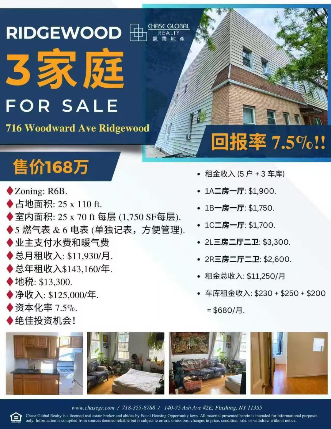 凯业地产Ridgewood 皇后区房子3家庭出售 回报率7.5% 💰售价$168万已有多个offer