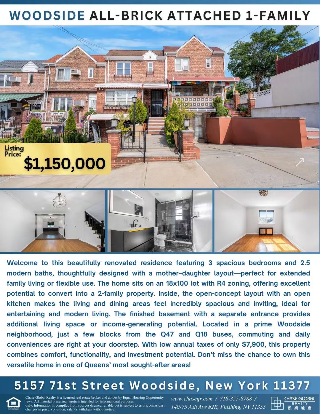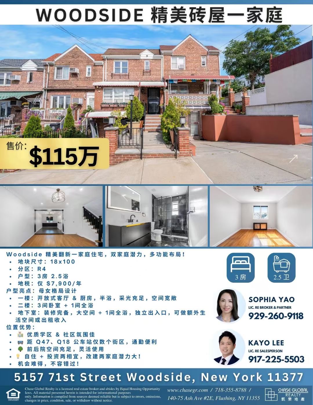 独家代理Woodside皇后区房子出售漂亮一家庭地面三层,全新装修,母女屋设计占地18*100,Zoning R4(可合法改2家庭)这套房子内外全部翻新,屋顶4年新,设施全新,拎包入住!母女屋格局,分层独立出入口,私密又方便。4间卧室 + 2.5浴室,空间充裕,一楼:开放厨房、餐厅,大客厅、半浴,前后阳光房可直通后院;二楼:3房+豪华浴室;地下室:Walk in,独立出入,一房一厅,直通后院,周边配套齐全,交通便利,近多条地铁和巴士Q47/Q18,生活机能一应俱全。💰 低地税$7,900💵 售价:$115万欢迎合作,清空,随时看房!