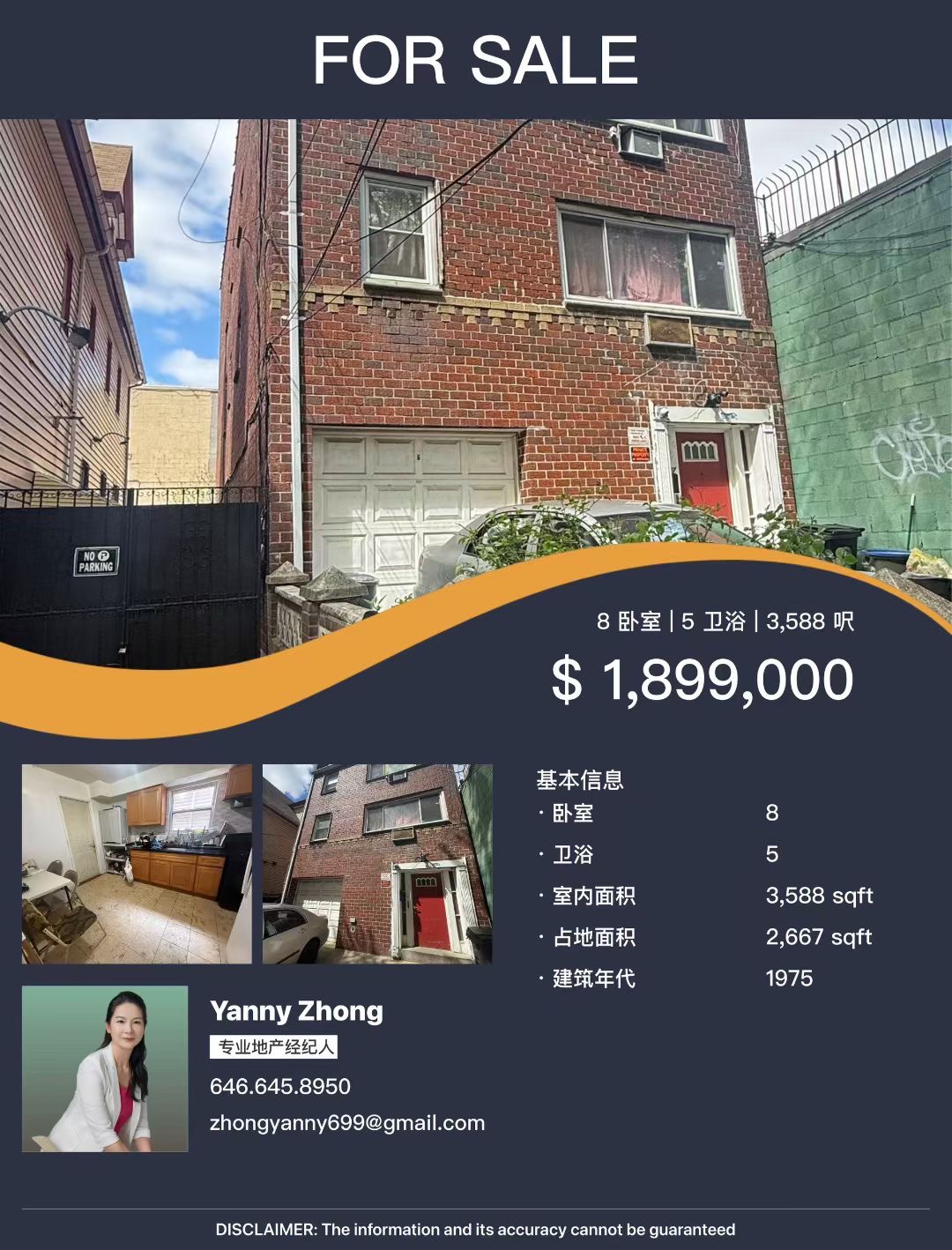 🏡✨ 皇后区核心地段,皇后区房子出售多户住宅投资首选 ✨ 结构亮点:合法双户型,多层砖结构住宅(1975年建),共约 3,588 平方英尺,8卧5卫,配有装修完善的地下室与独立车库。