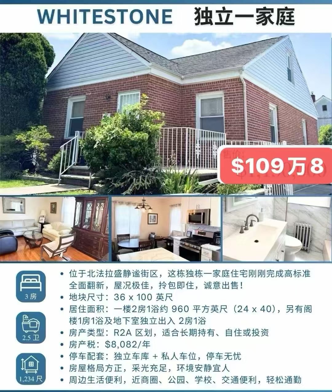 北法拉盛漂亮一家庭出售109万8163-x 25th Ave Flushing NY 11357位于北法拉盛静谧街区,这栋独栋一家庭住宅刚刚完成高标准全面翻新,屋况极佳,拎包即住,诚意出售!