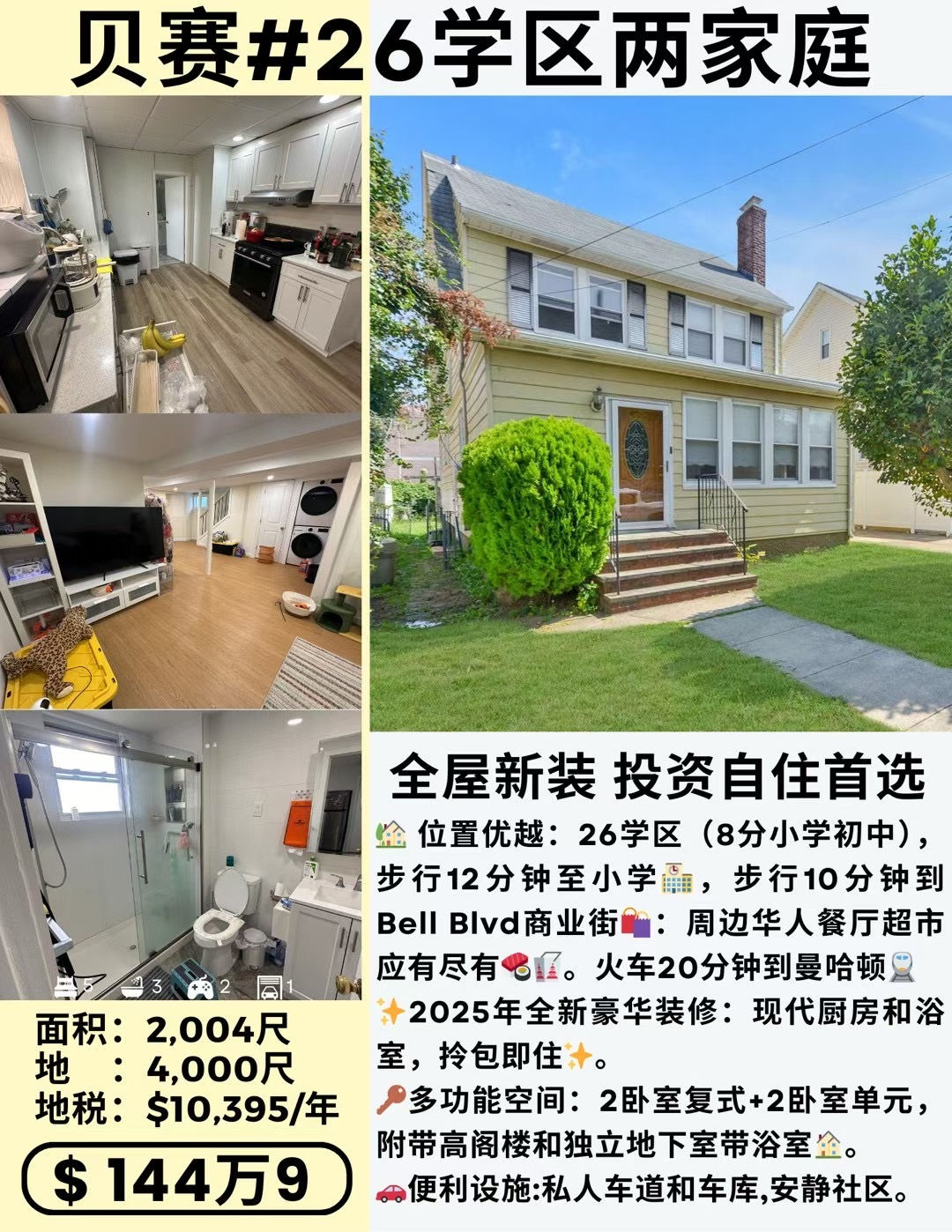 位于26学区,步行12分钟至小学🏫,步行10分钟到Bell Blvd商业街🛍️,周边有丰富的华人餐厅和超市🍣🥡。火车20分钟到曼哈顿🚆