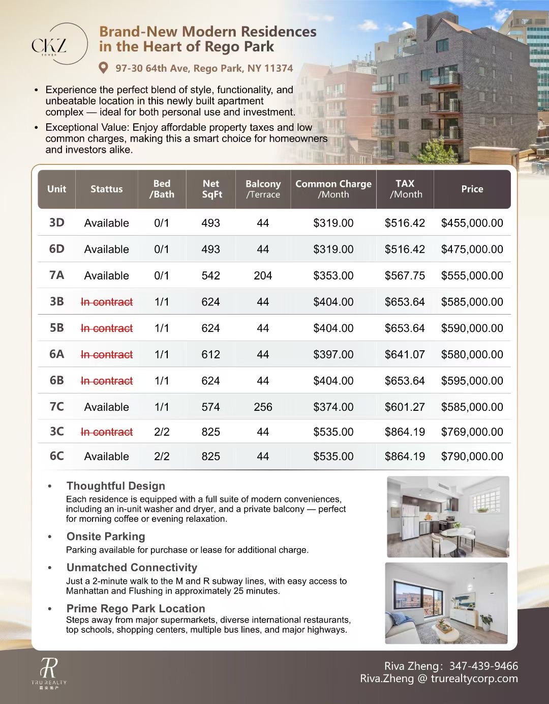 位于 Rego Park 核心地段 的 CKZ Tower 公寓,现正火热上市,价格仅 $455,000 起,为都市自住和投资买家提供 高性价比选择。该项目坐落在繁华商圈中心,周边生活配套齐全,交通便利,是 Queens 区置业的 理想投资与居住选择。