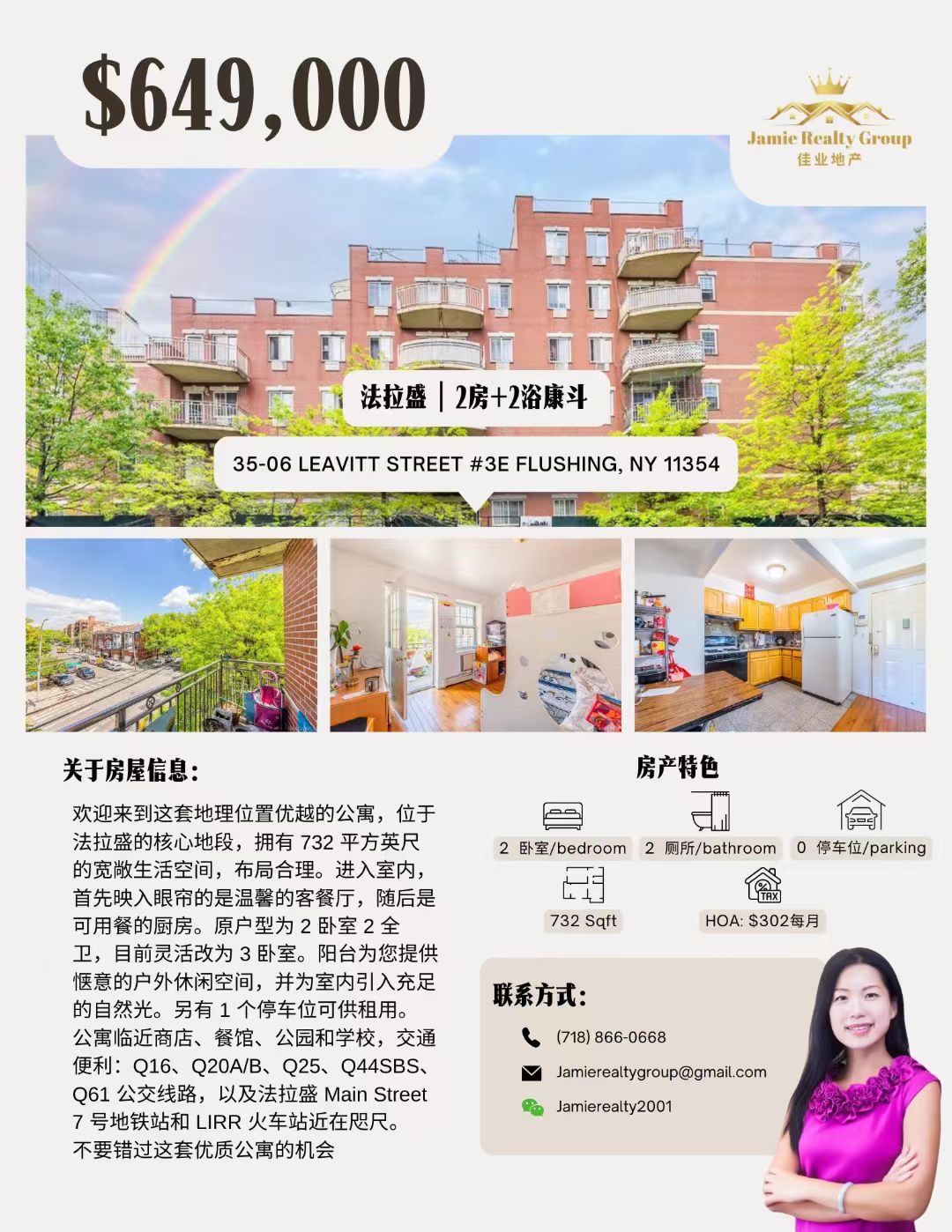 法拉盛核心地段的优质公寓,这套公寓面积 约732平方英尺,布局合理、空间宽敞,完美兼顾舒适生活与实用功能。原户型为 2卧2全卫,目前灵活改为 3卧室,非常适合小家庭、上班族或学生居住。