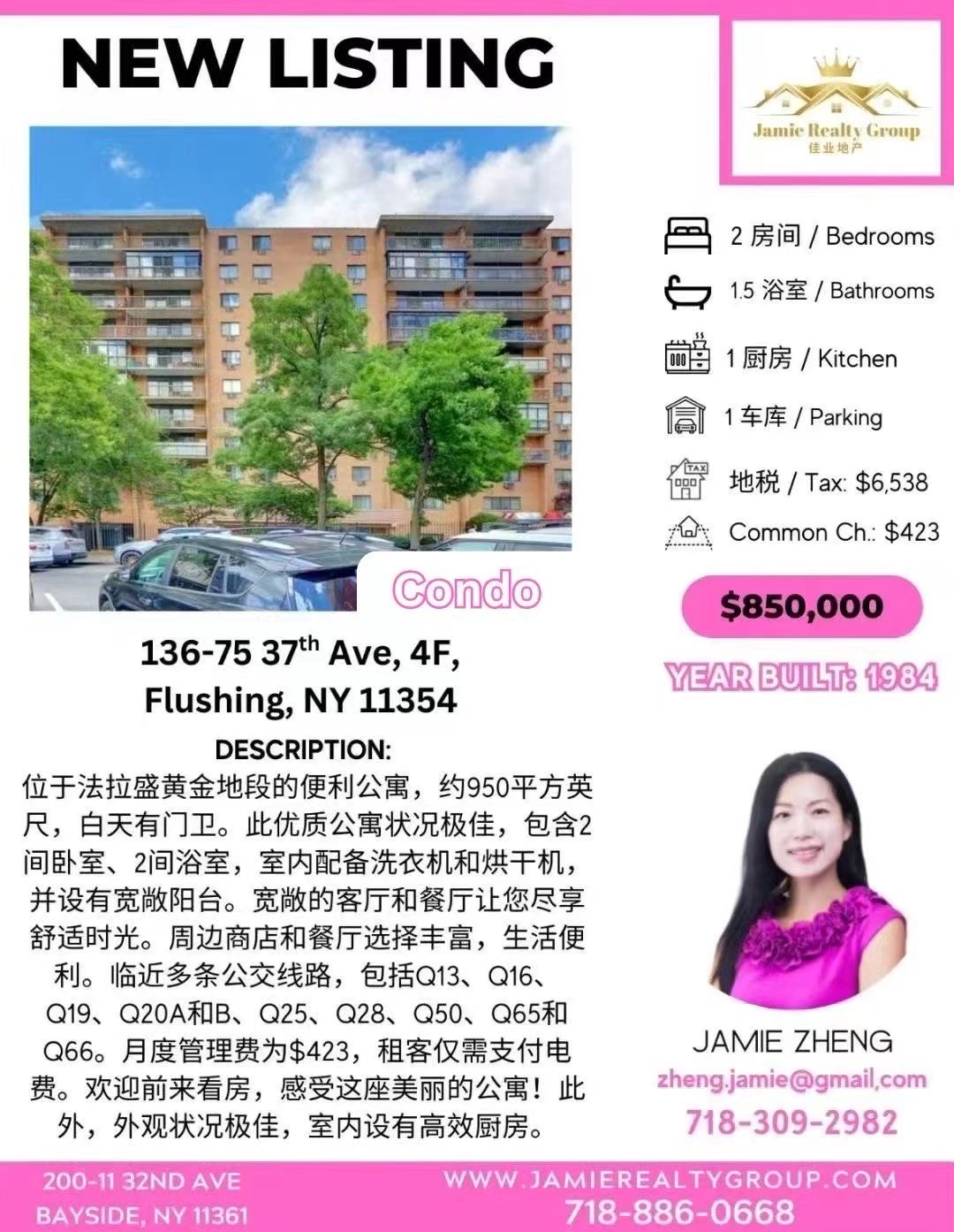 法拉盛核心黄金地段的优质公寓——位于 136-75 37th Ave, 4F, Flushing, NY 11354。这套公寓面积约 950平方英尺,布局宽敞合理,包含 2间卧室和2间全浴室,非常适合家庭自住或投资出租。