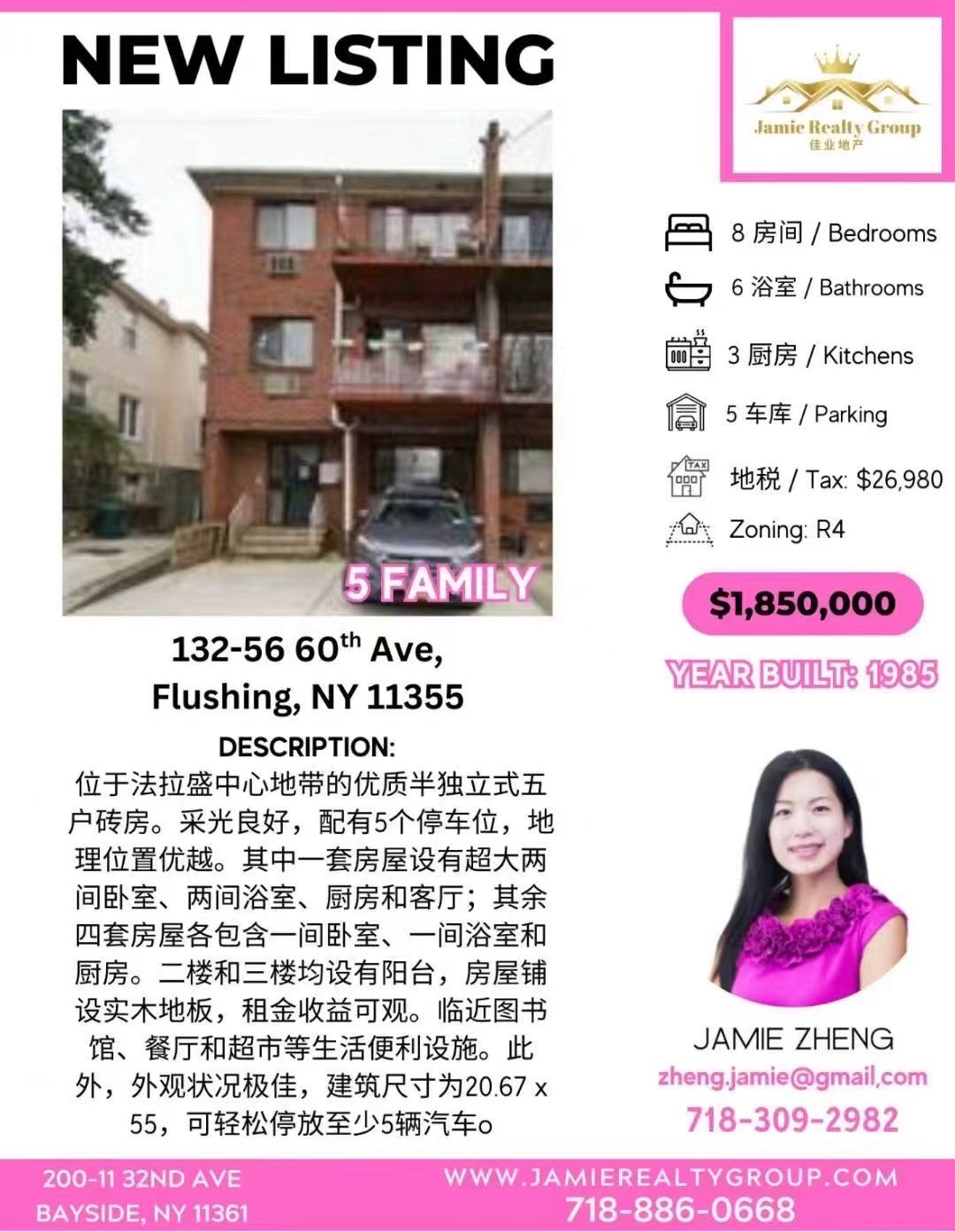 这栋 法拉盛五家庭半独立砖房结合了 优越地理位置、稳定租金收益与自住便利性,是寻求投资回报或大家庭居住的绝佳选择。无论您是投资者还是希望在黄金地段拥有多单元住宅的家庭,都不容错过。