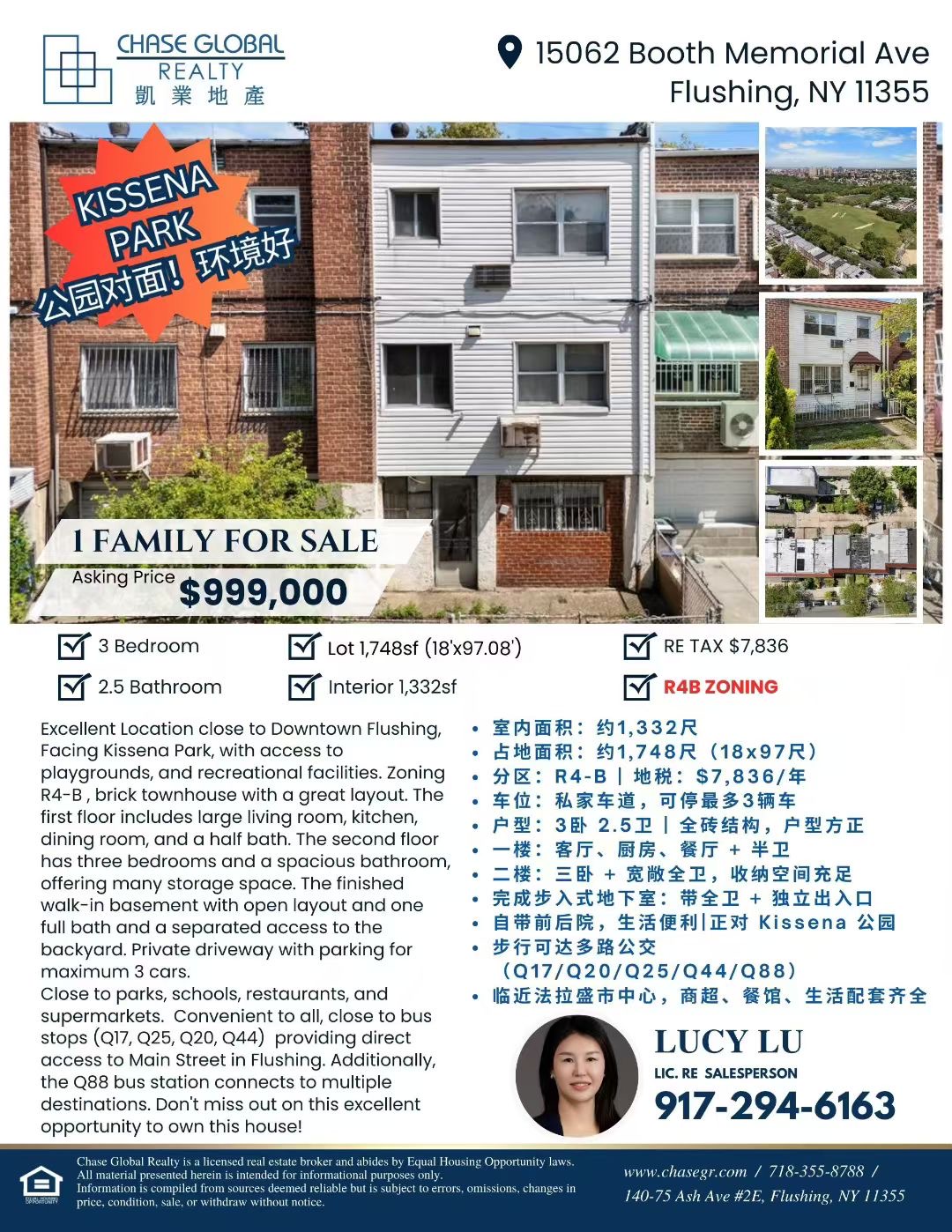 这套 Flushing 法拉盛 Kissena Park 一家庭住宅 是希望在 法拉盛核心地段拥有舒适独立住宅 的家庭或投资者的理想选择。无论是自住、出租还是未来增值投资,这里都能满足您对舒适生活、便利交通和优质地段的多重需求。