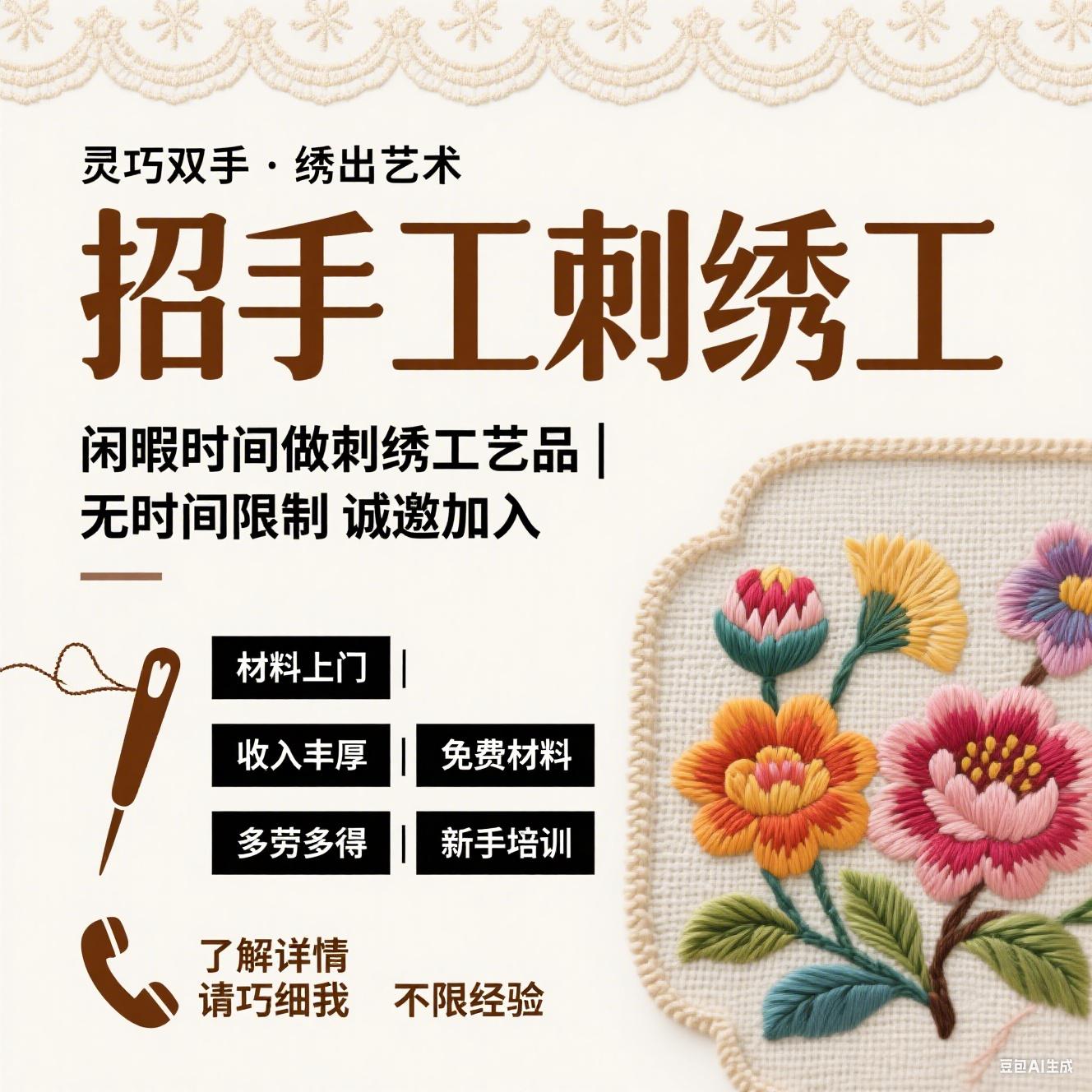 招灵活手巧有时间刺绣的人员,有意者联系小程6462805590