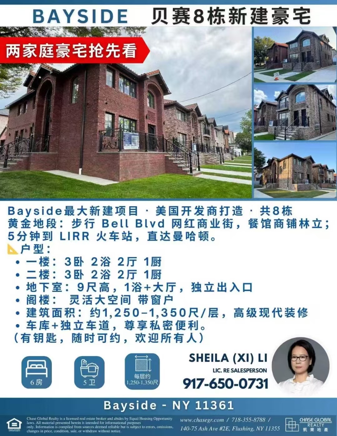 Bayside贝赛重磅新盘!8栋全新双家庭豪宅,Bell Blvd黄金地段,步行5分钟到LIRR直达曼哈顿。户型方正宽敞,每层3卧2浴2厅1厨,附9尺地下室+独立出入口,另有采光阁楼,车库+独立车道停车无忧。现房即享,有钥匙随时看,售价合理,投资与自住两相宜。欢迎买家及同行经纪合作!预约Sophia Yao Team:Sheila 917-650-0731 / Kayo 917-225-5503 / Sophia 929-260-9118。