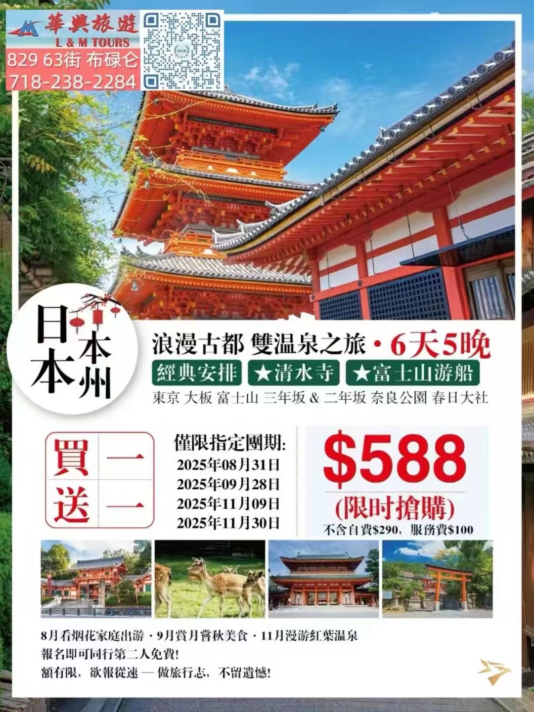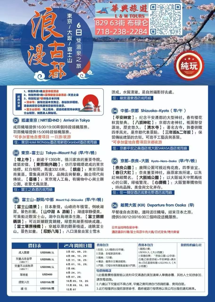 限时抢购!浪漫古都日本双温泉6天5晚游,涵盖东京大清水寺、富士山游船、京都清水寺、三年坂&二年坂、奈良公园春日大社、大阪城及心斋桥购物体验。全程精选酒店住宿含温泉体验,享受德国Bosch电器和日式美食。团期仅限2025年08月31日、09月28日、11月09日、11月30日,超值价格$588/人。自由行与跟团游完美结合,投资旅游体验首选!
