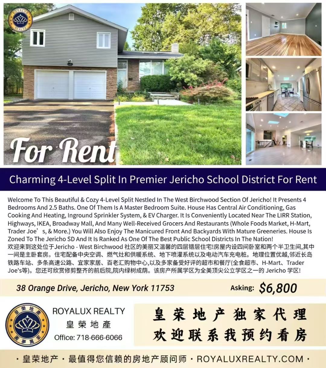 【新上市】皇荣地产独家代理出租好房🎖️长岛 Jericho 美丽温馨的四层错层住宅出租 | 租金$6800