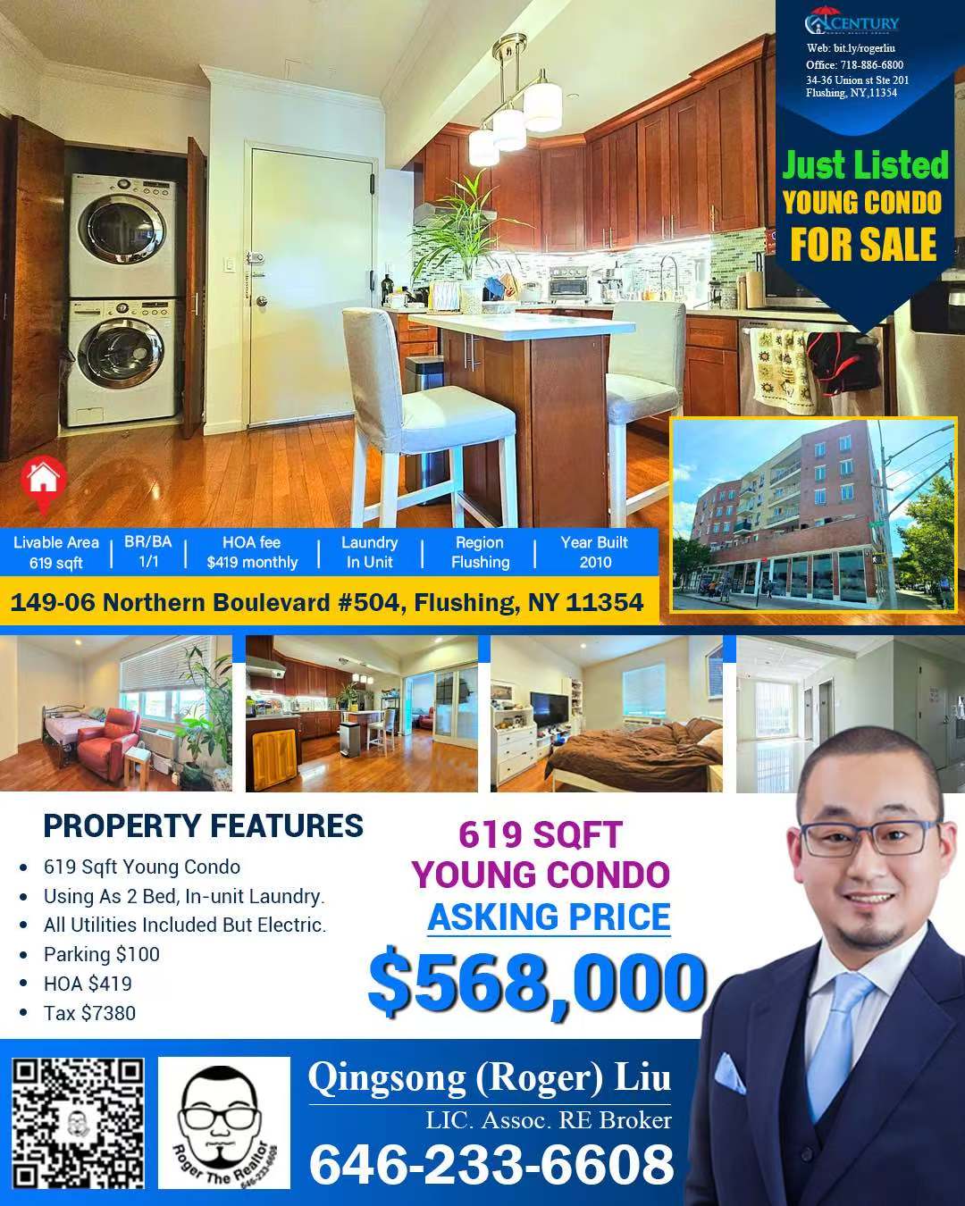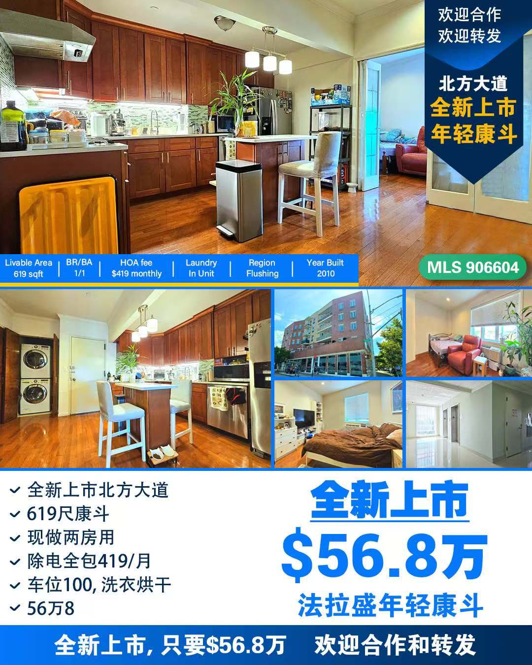 法拉盛北方大道全新上市康斗出售!📍619平方尺,现做两房使用,管理费全包(除电)仅$419/月。配有专属车位$100/月,室内洗衣烘干设备,居住便利。售价$56.8万,性价比高,适合年轻家庭或首次购房者。地理位置优越,生活、交通便利,周边餐饮、商场和公共交通齐全。欢迎房地产经纪合作和信息转发,轻松投资或自住首选。