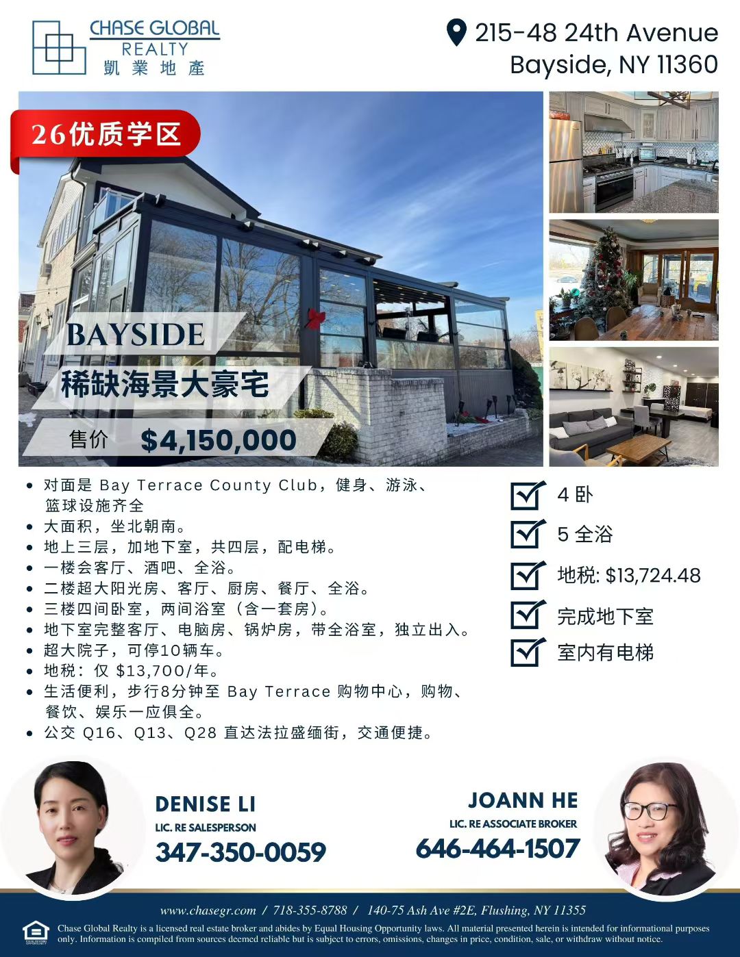 🎈 超大占地面积,26好学区,坐北朝南,对面就是Bay Terrace County Club,健身,游泳,篮球等运动非常方便;