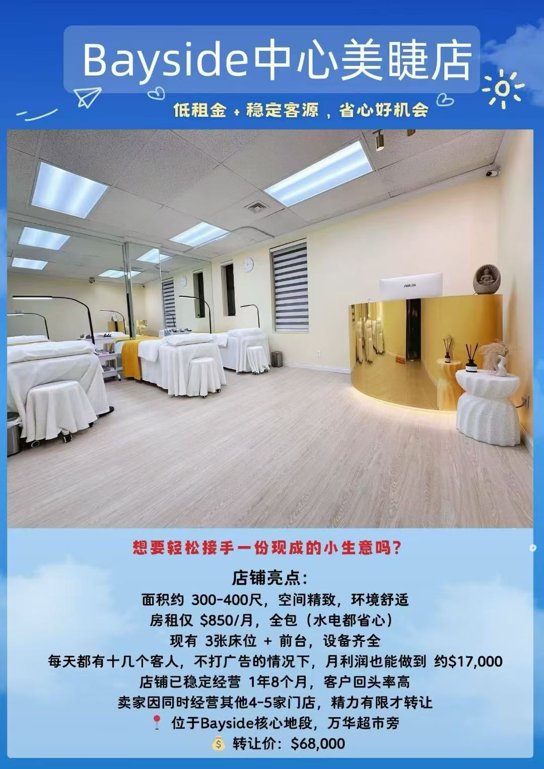 💥捡漏机会!Bayside核心Bell Blvd睫毛店低价转让,仅$68,000即可拥有月入$17,000的现金流!房租仅$850全包,3床位+前台+设备齐全,日均十几客源,客户回头率超高。经营1年8个月,口碑稳定,接手立即盈利。黄金地段人流爆棚,适合想创业当老板或美业扩张投资者,卖家因同时经营多店忍痛割爱!机会稀缺,错过不再有!