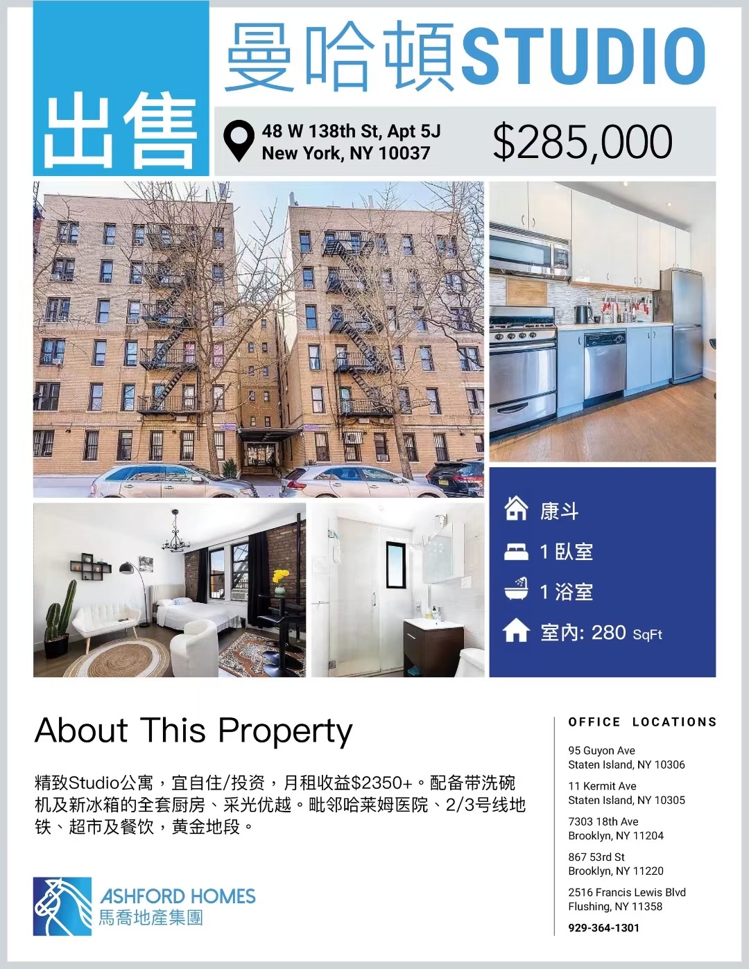 曼哈顿 48 W 138th St, Apt 5J Studio 公寓,1卧1卫,室内280平方英尺,售价$285,000。精致小户型,采光良好,全套厨房设备(含洗碗机及新冰箱),月租收益约$2,350+。毗邻哈莱姆医院、2/3号线地铁、超市及餐饮,交通便利,生活机能完善。黄金地段,投资自住两相宜,小户型稀缺机会不容错过。
