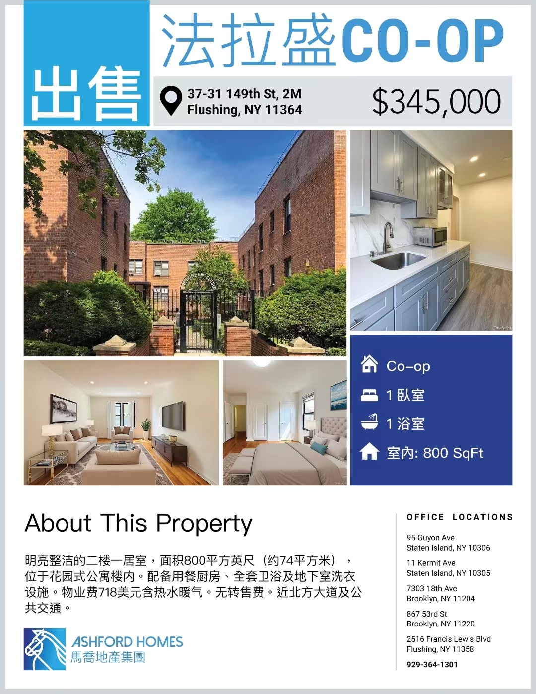 法拉盛核心地段的 37-31 149th St, 2M Co-op 公寓新上市,售价 $345,000。这套二楼一卧一卫的花园式Co-op公寓,室内面积约 800平方英尺(约74平方米),采光充足,布局合理,是自住和投资的理想选择。