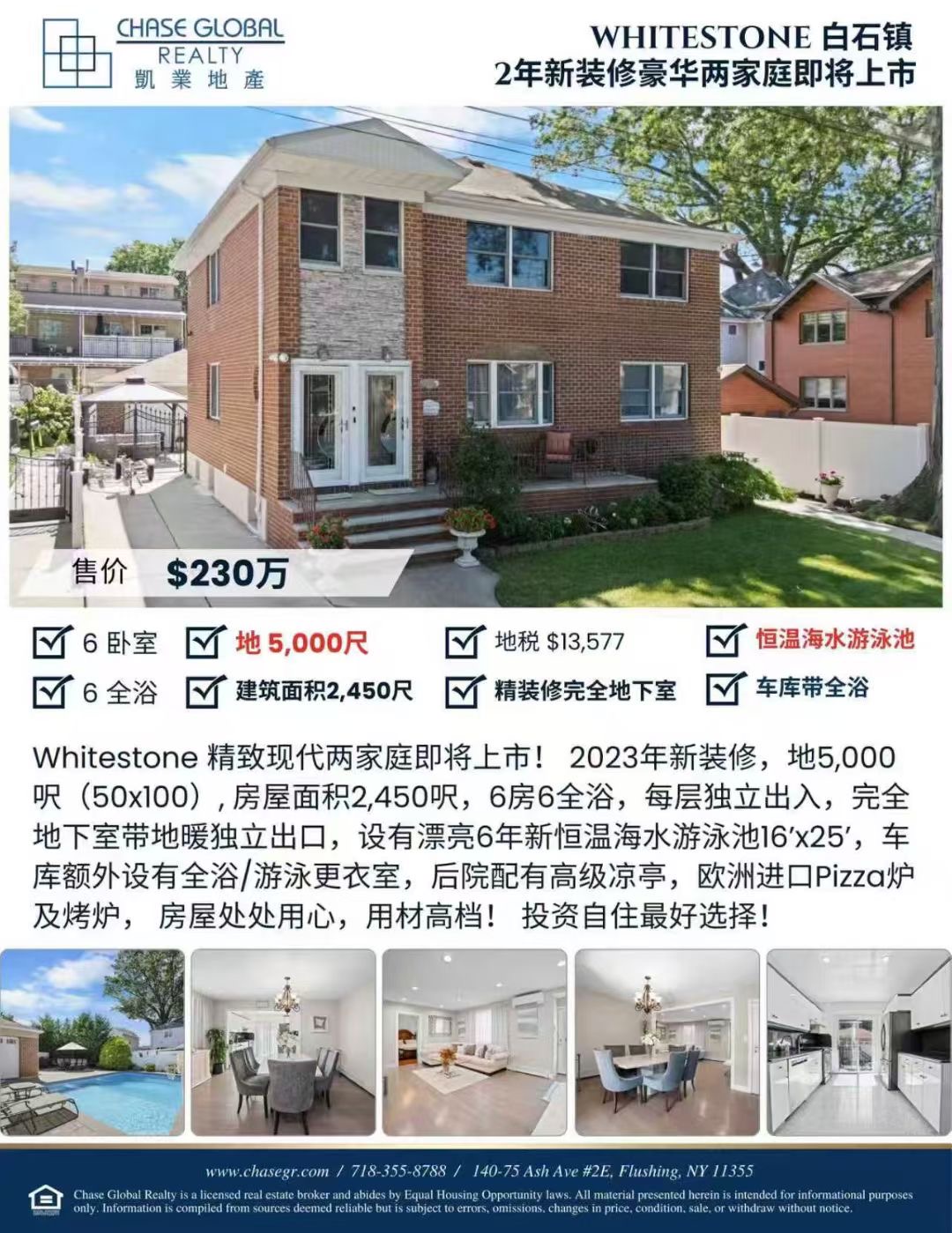 Whitestone高端现代两家庭住宅,2023年全新装修,地块5000呎(50x100),房屋面积2450呎,6房5全浴,每层独立出入,地下室全装修带地暖和独立出口。特色设施包括6年新恒温海水泳池16’x25’,车库配全浴/游泳更衣室,后院高级凉亭、欧洲进口Pizza炉和烤炉。豪华用材,布局合理,投资自住皆宜。欢迎合作转发,有兴趣请联系Erin Wang 646-556-5527。