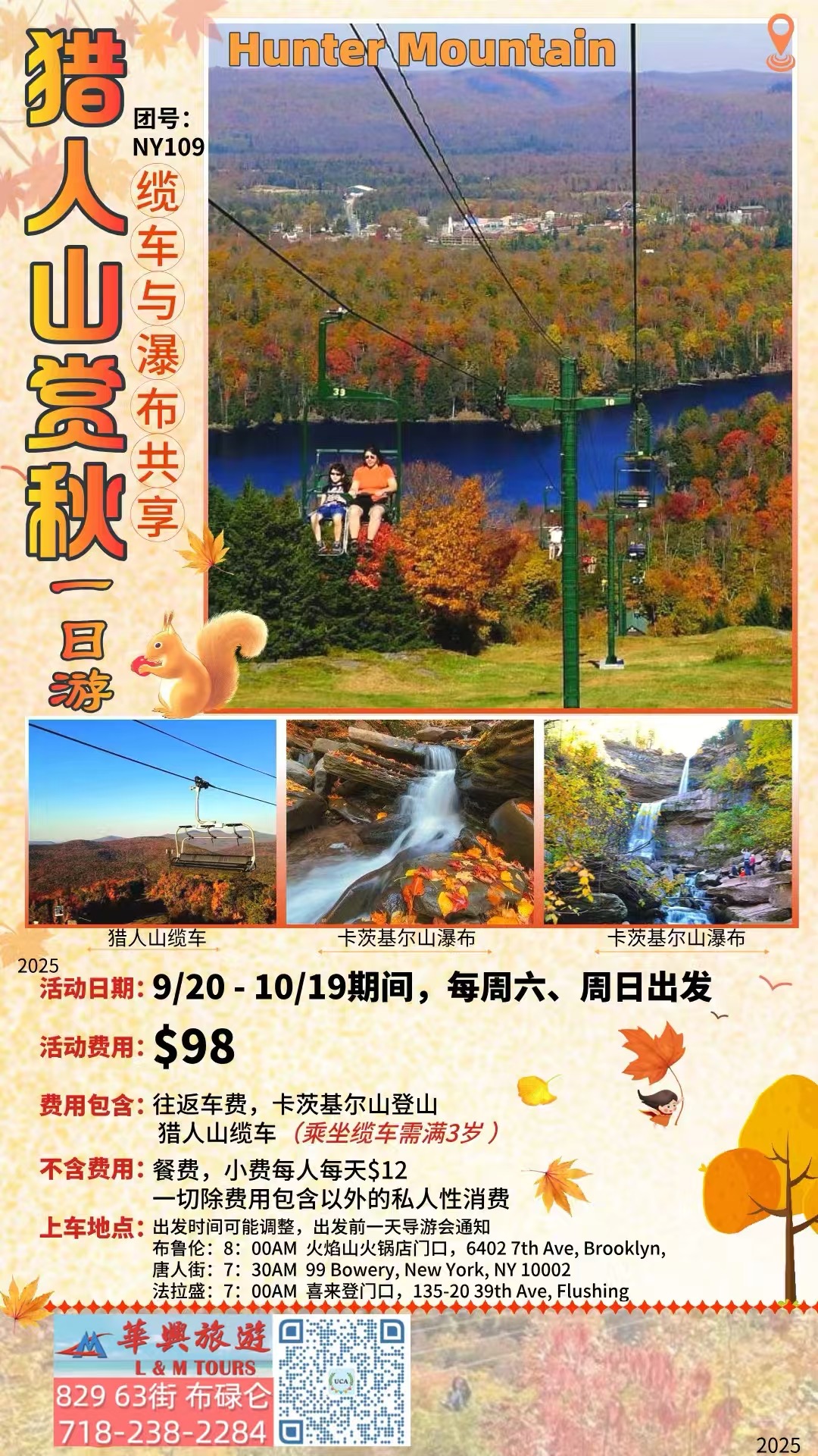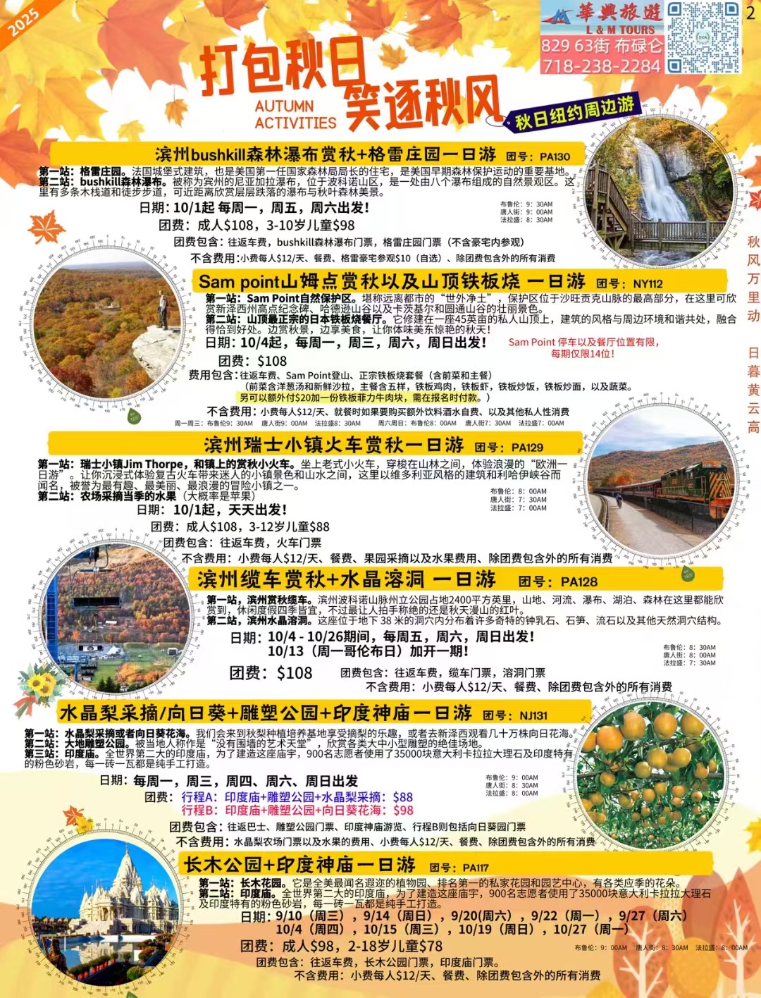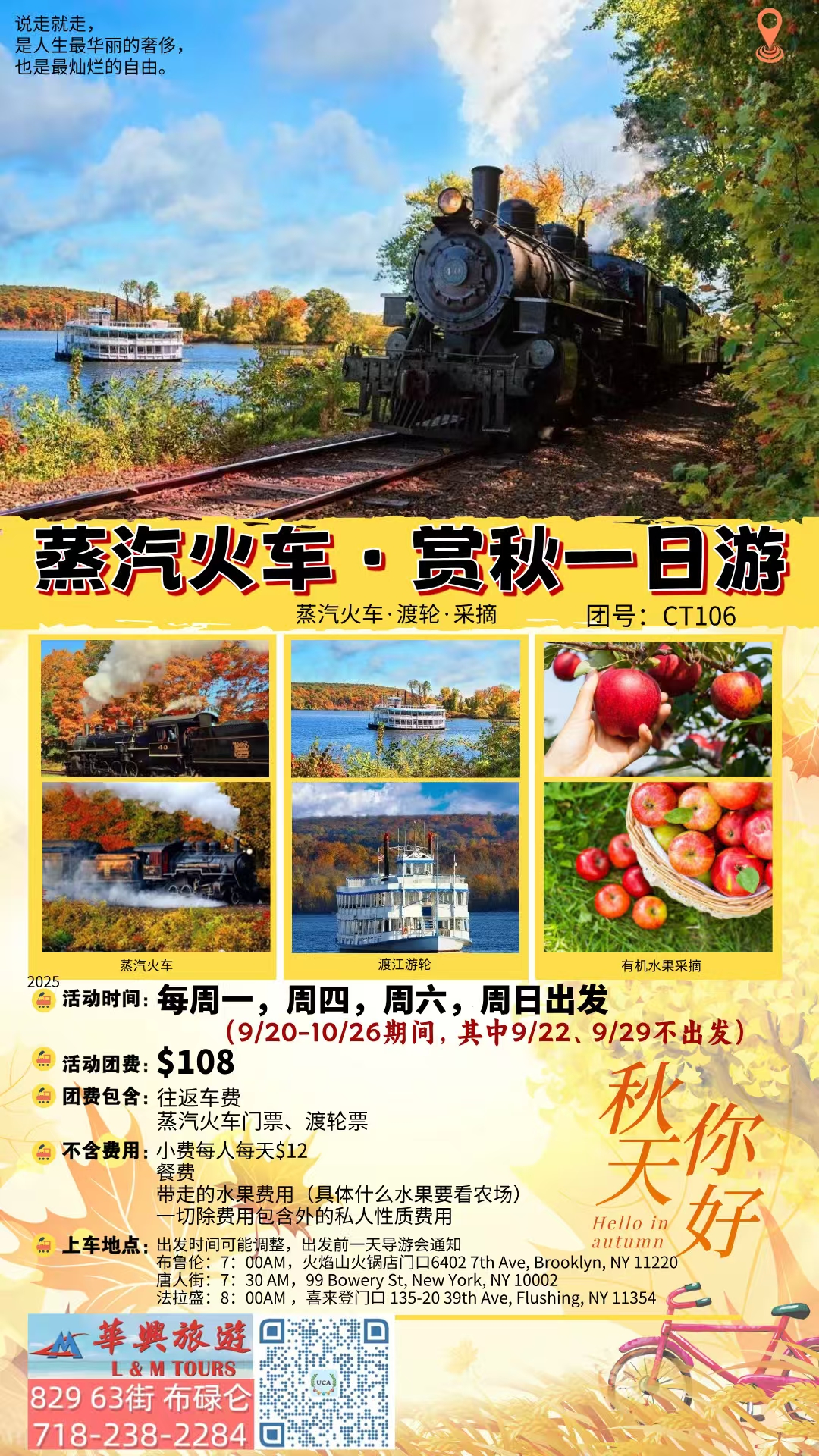 🍁2025秋季纽约周边精选一日游大集合!乘坐蒸汽火车穿越康州原生态美景,体验渡江游轮浪漫风光;带孩子探索全球最大乐高乐园,七大主题区互动玩乐;夜晚放飞孔明灯,寄托心愿与梦想;体验六旗万圣节惊魂节,挑战胆量尖叫不停;农场采摘苹果、水果,亲子互动乐趣无穷;穿越猎人山、卡茨基尔山、森林瀑布等秘境,欣赏绝美红叶秋景。行程集合地点布鲁克林、唐人街、法拉盛,费用合理,部分含门票与车费,小费及餐费自理。秋季最丰富、最适合家庭、情侣、好友的周末活动,让你一次玩遍自然、美食与文化,留下难忘回忆。