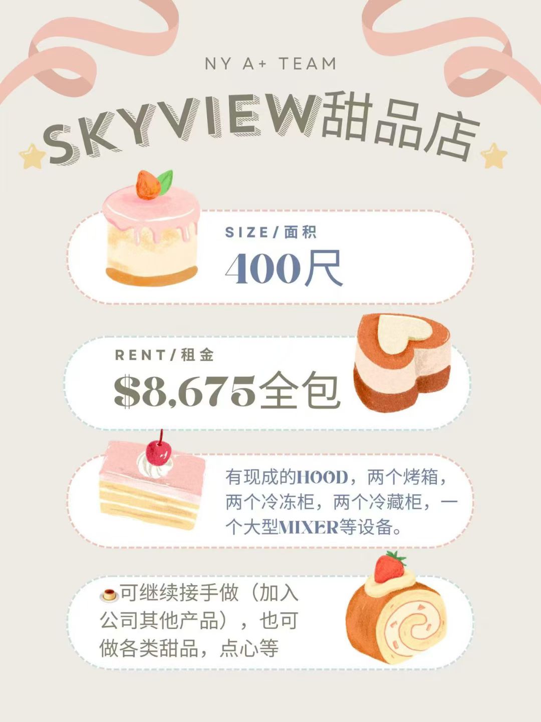 法拉盛Skyview甜品店现独家转让,售价仅$7.5万。店铺位于Skyview商圈核心位置,面积约400平方尺,租金$8,675/月(全包),提供成熟稳定的客源。店内配备齐全,包括(1)hood、(2)烤箱、(2)冷冻柜、(2)冷藏柜、(1)大型mixer等所有必备设备,接手即可营业,无需额外投资。