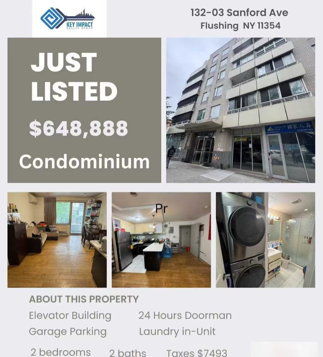 法拉盛市中心,这套2房2浴康斗提供舒适与便利兼具的生活体验,附带私人车位,适合家庭或投资者。室内空间布局合理,客厅宽敞,卧室舒适明亮,带有私人阳台,采光充足,空气流通良好。厨房与浴室设备完善,同时配有洗衣机和烘干机,提升居家便利性。