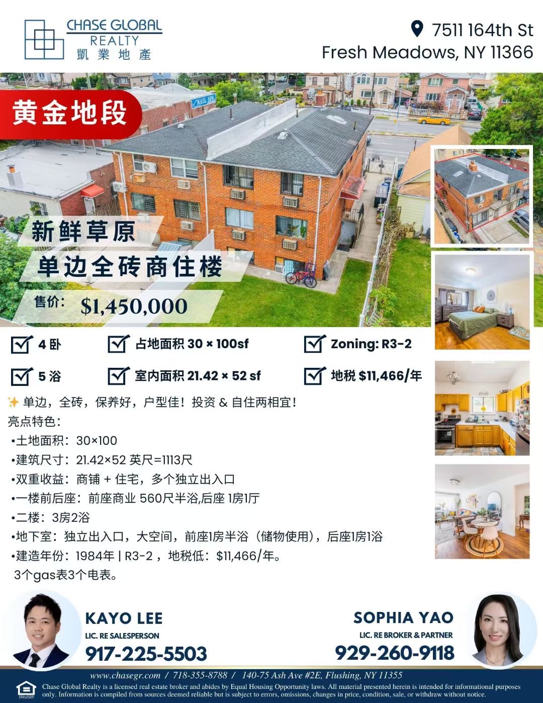 该物业投资潜力大,兼具自住与商业收益,适合多种用途。Fresh Meadows稀缺房源,抓住机会,欢迎预约看房。联系人:Sophia Yao 929-269-9118 / Kayo Lee 917-225-5503。