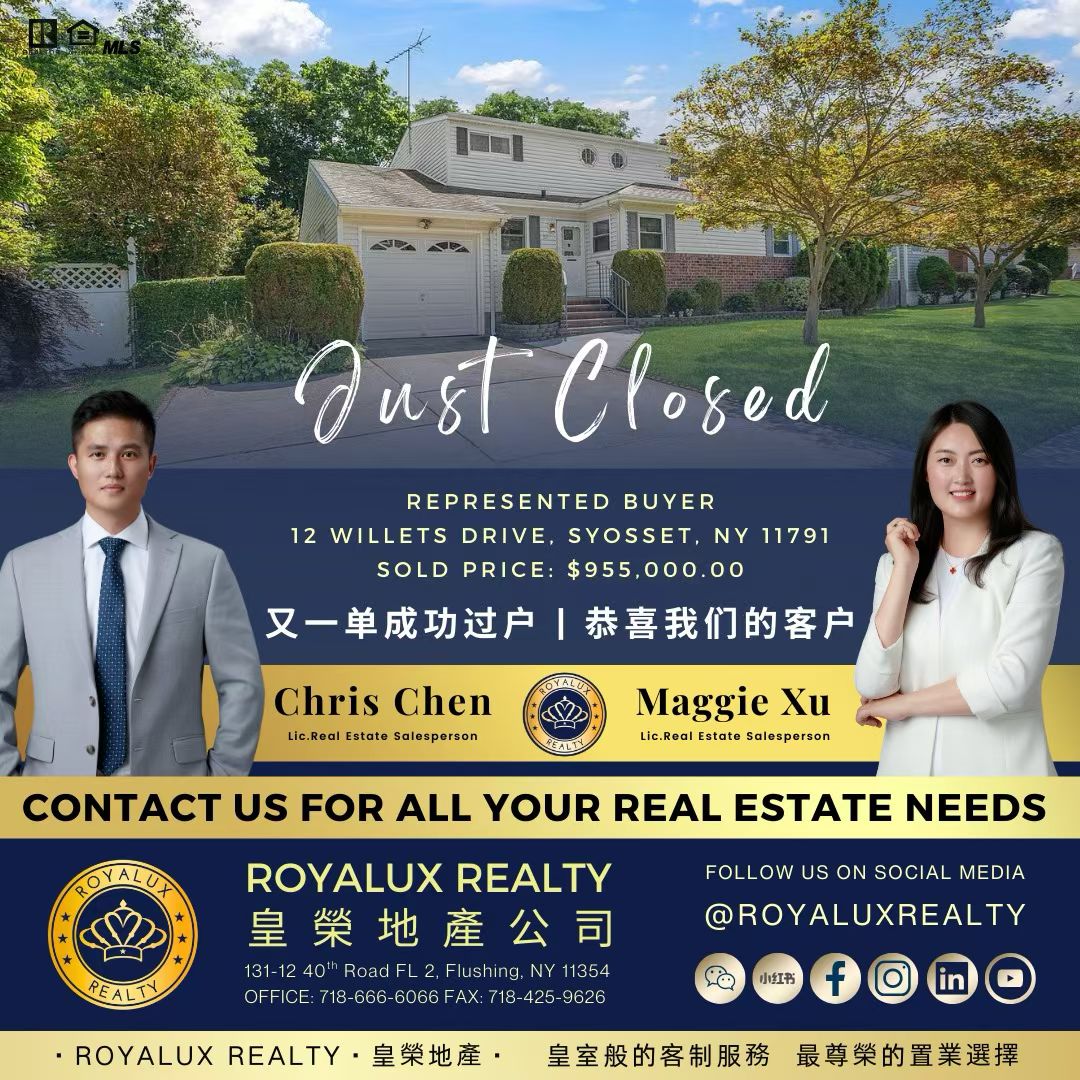 🎉 恭喜客户成功过户心仪房源!在纽约房地产市场中,找到理想房源并顺利完成交易是一件令人兴奋的事。皇荣地产Chris Chen & Maggie Xu凭借丰富的经验和专业服务,再次帮助客户成功抢到优质房源,并顺利完成买卖过户,让客户安心安家置业。我们始终以客户的需求为核心,提供从房源搜索、实地看房、交易谈判到过户全程一站式服务,确保每一位客户都能高效、顺利地完成房产交易。