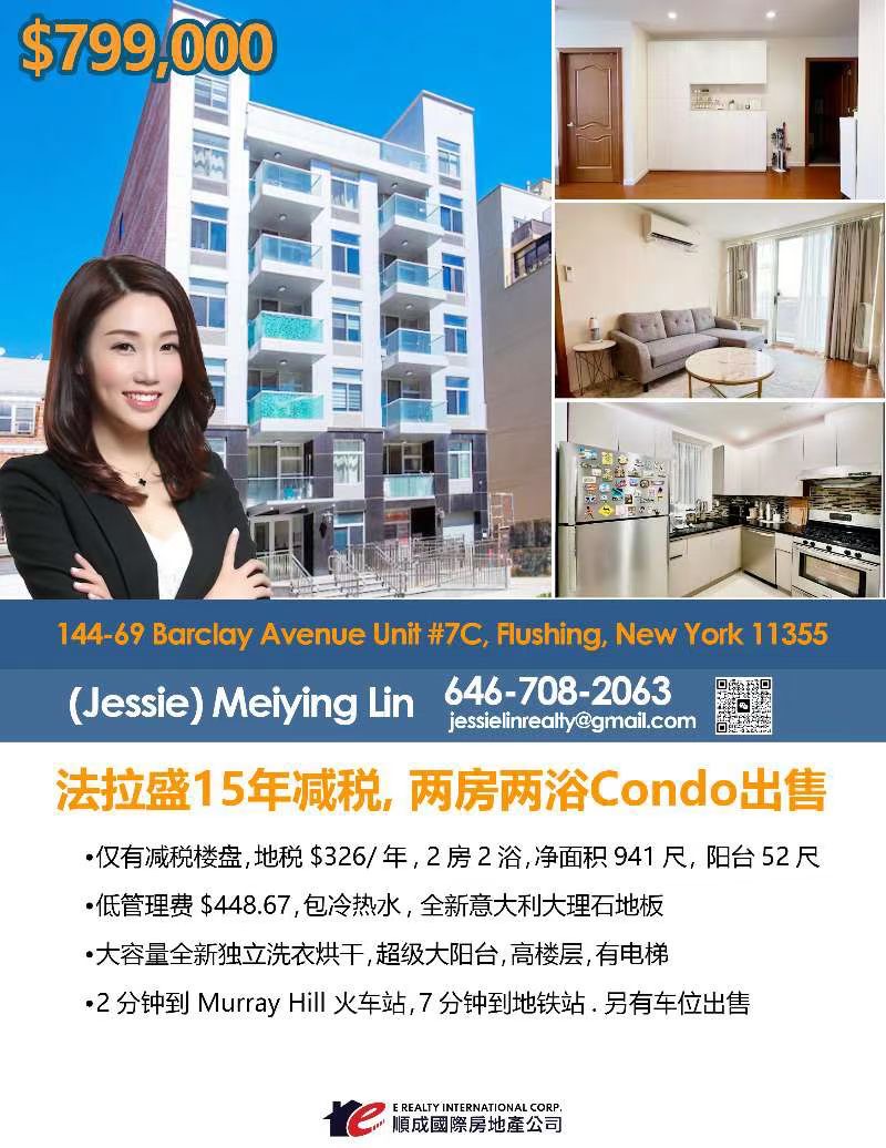 纽约法拉盛核心地段新上市15年减税Condo,售价$799,000,两房两浴+大阳台,净面积941尺,低管理费仅$448/月,地税每年仅$326!全新意大利大理石地板,独立洗衣烘干机,高楼层电梯房,采光充足。步行2分钟到Murray Hill火车站,7分钟直达地铁,交通便利,另有车位出售。稀缺减税房源,投资自住两相宜,欢迎预约看房!