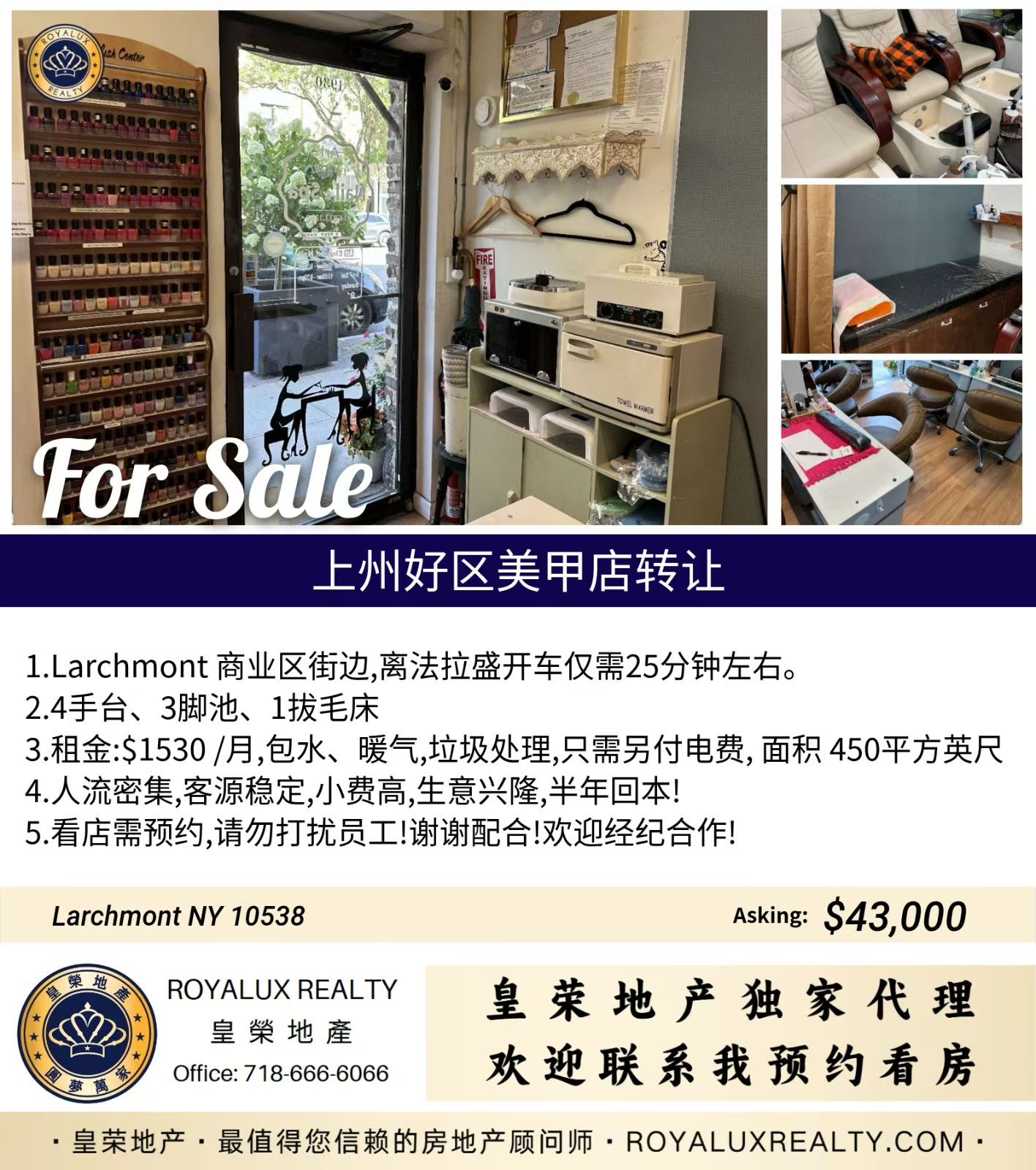 上州Larchmont美甲店现转让,皇荣地产独家代理,售价$43,000。店铺位于商业区街边,交通便利,距法拉盛仅25分钟车程,适合希望拓展上州市场的投资者或创业者。