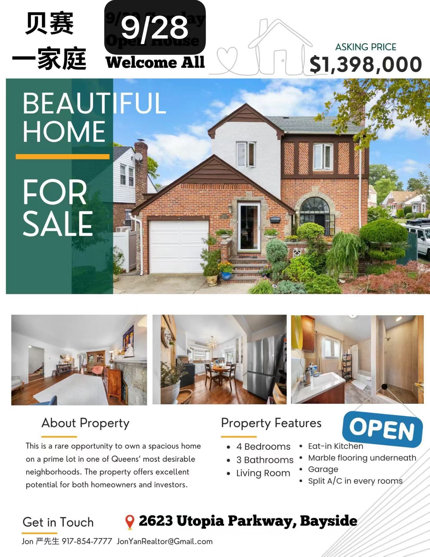 纽约Bayside贝赛稀缺好房,2623 Utopia Parkway独栋住宅,首次公开展示:9/28周日。4卧3浴,宽敞舒适,每个房间配备分体空调,客厅明亮通透,地板下铺设大理石,质感满满。独立后院适合烧烤、聚会或园艺,私人车道+车库车位停车便利。地理位置优越,靠近学校、公园、购物中心及餐厅,交通方便,高速及公交地铁快捷。优质学区,适合家庭自住或高潜力投资。立即预约私享看房,抓住稀缺机会!