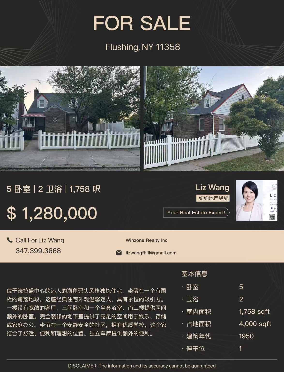 Flushing, NY 11358优质独栋住宅出售,总价$1,280,000,地块尺寸40×100,1951年建,经过加建后共两层+地下室,拥有5间卧室和3间浴室,空间充足,格局合理,适合家庭自住或长期投资。