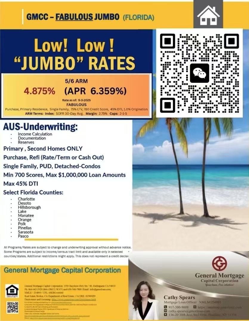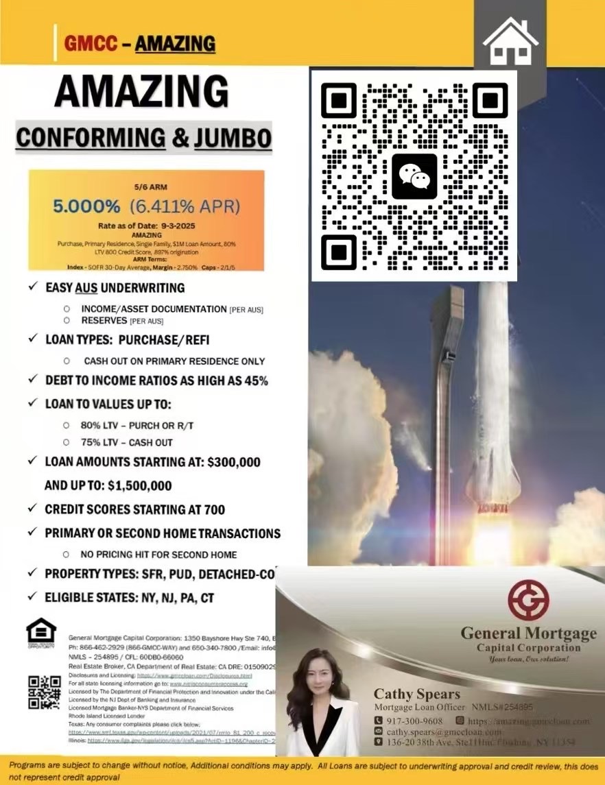 目前 查收入房贷利率低至4.875%,不查收入利率5.5%起,利率下调,购房成本更低,投资或自住房贷款皆可申请。无论首次购房还是再融资,均可享受优惠利率。贷款申请流程简单,专业指导全程协助,随时解答客户疑问。📞 联系贷款顾问 Cathy 917-300-9608,获取最新利率信息与贷款方案,抓住低利率置业机会!