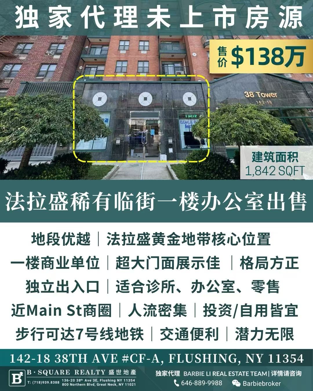法拉盛Main St核心商圈 的临街一楼办公室/商业单位现已上市,由 盛世地产 Barbie Li Team 独家代理。该房源 未上市,稀缺性极高,是投资或自用的理想选择。