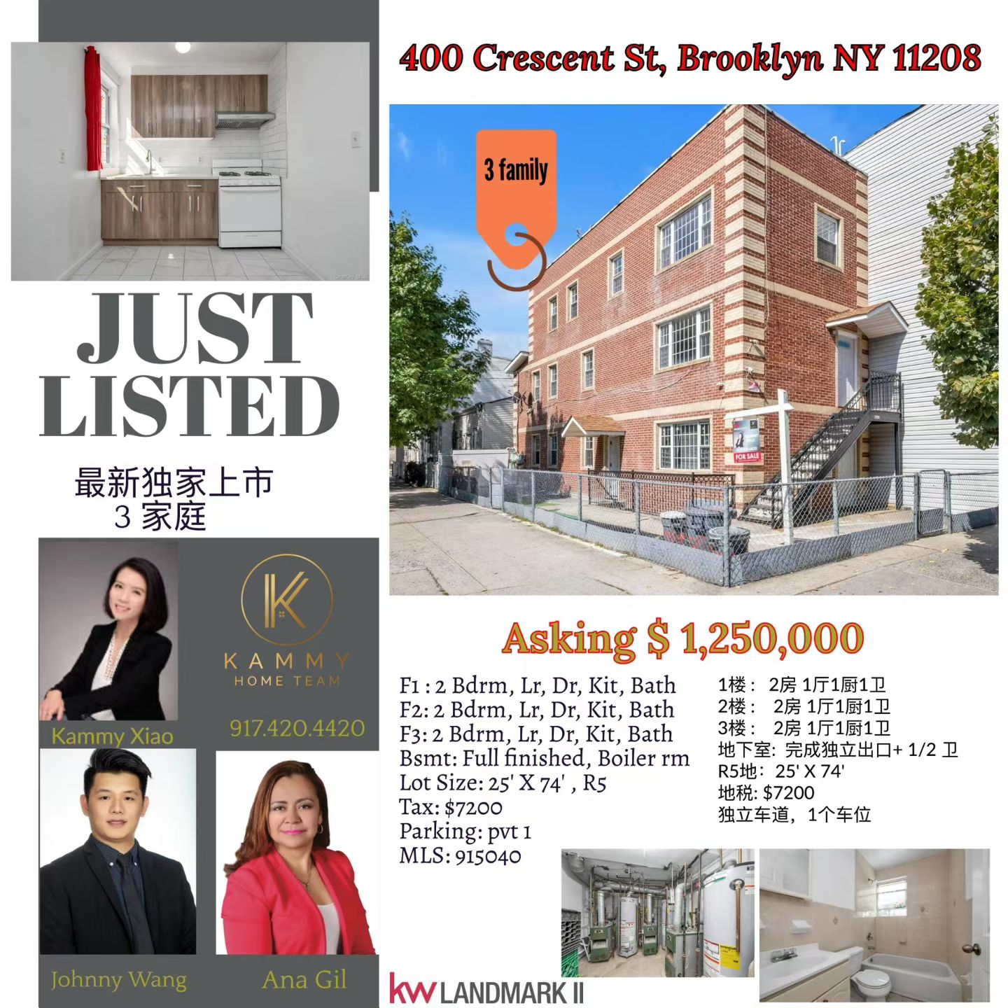 布鲁克林11208区 的独家上市房源,地址 400 Crescent St,售价 $1,250,000,为投资与自住的理想选择。