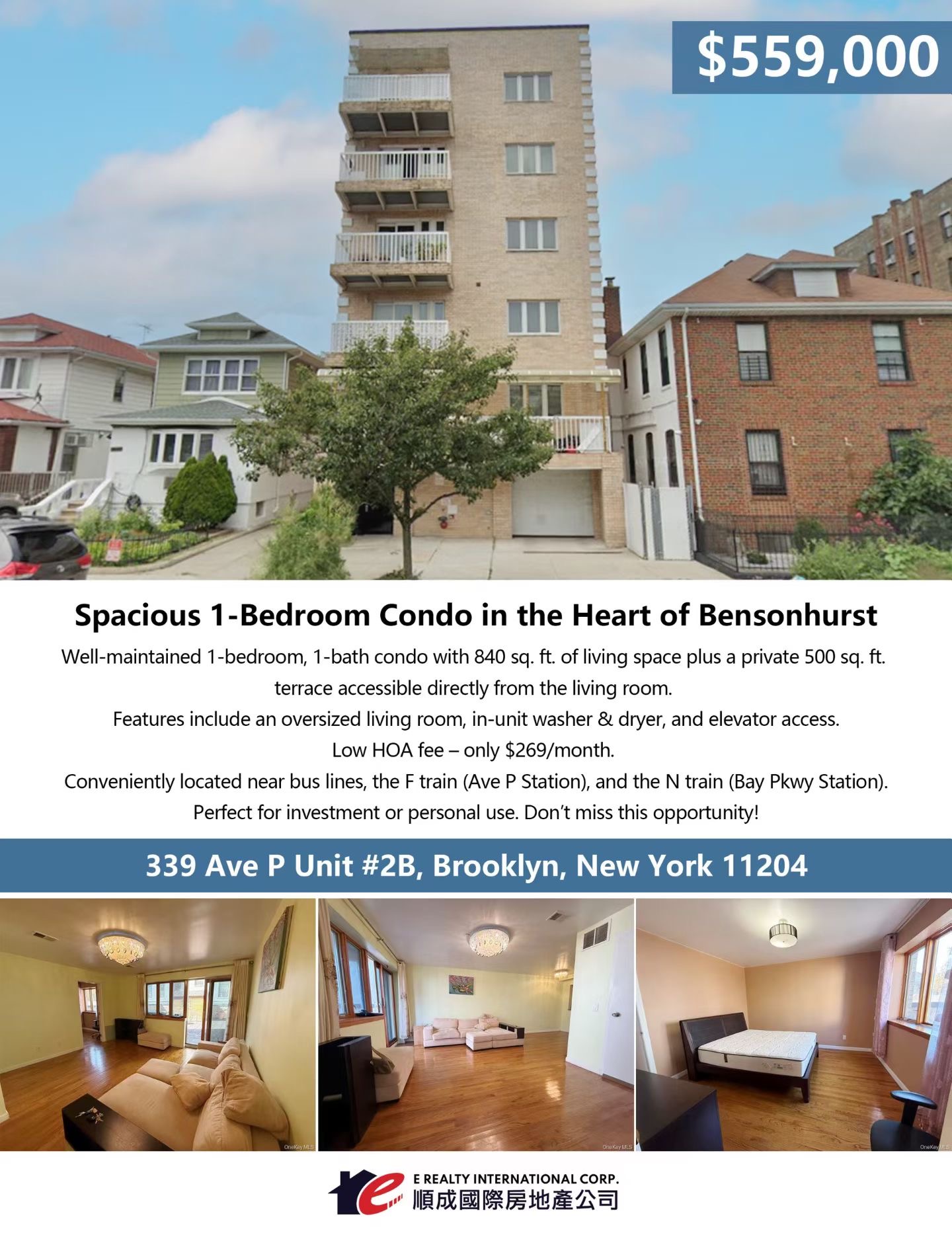 布鲁克林Bensonhurst核心地段,稀缺大露台电梯康斗最新上市!一房一浴,室内面积840尺,外加500尺私人大露台,客厅直通露台,享受阳光与舒适生活。全屋保养好,带室内洗衣机+烘干机,管理费仅$269/月。步行可达F线Ave P站与N线Bay Pkwy站,交通购物生活便利。售价$559,000,投资或自住都是超值选择!欢迎预约看房。