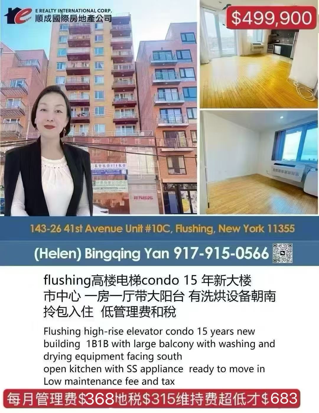 法拉盛中心地段稀缺康斗出售!143-26 41 Ave 10C 单元,一房一厅带大阳台,正南朝向采光极佳,可远眺曼哈顿景观。售价仅$499,000,管理费$368/月(包水),地税$315/月,室内自带洗衣机烘干机。电梯大楼,生活便利,步行即可到达Main St地铁站、超市、商场与餐厅。法拉盛市中心最具性价比的投资与自住公寓,机会难得!