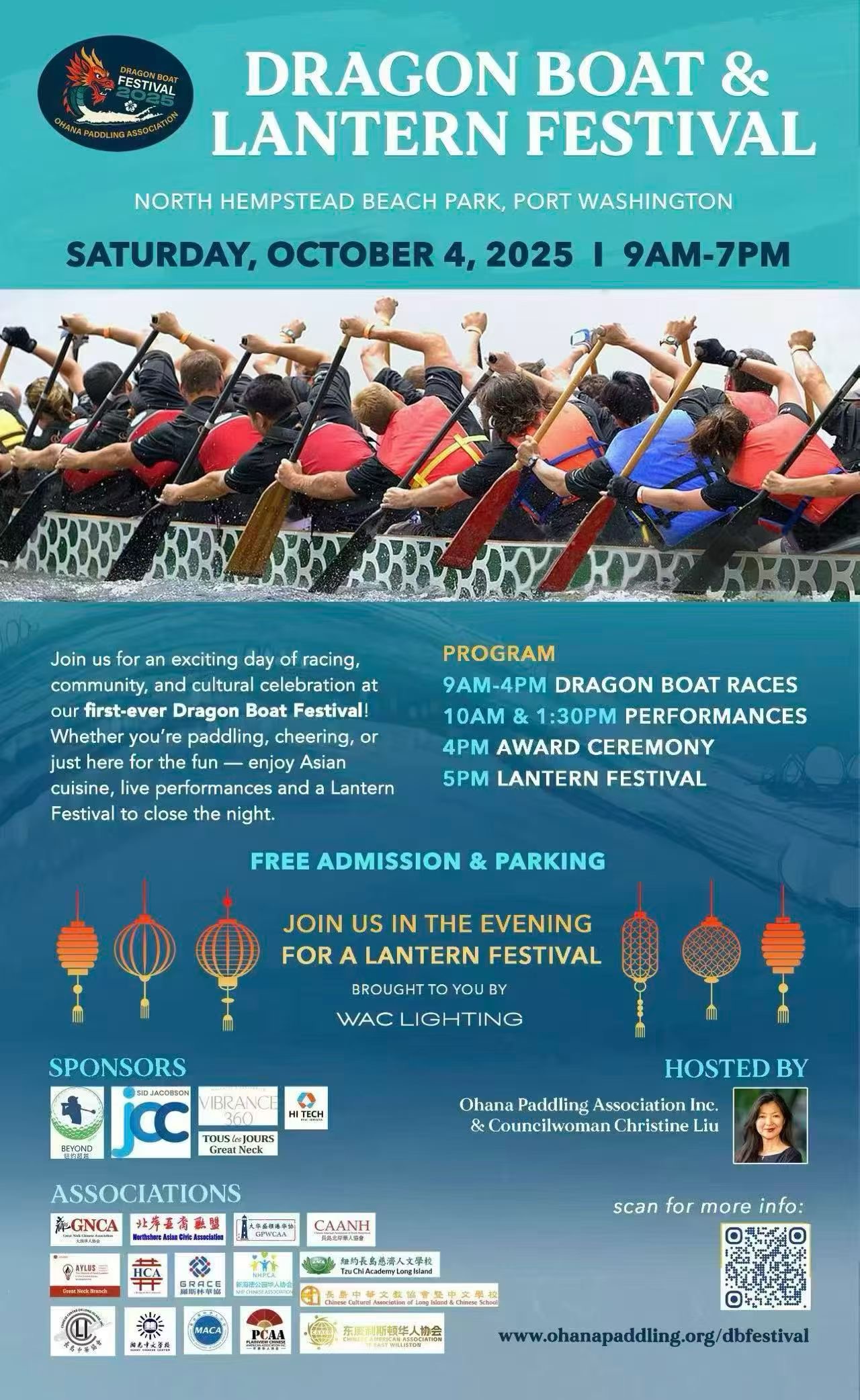长岛Port Washington迎来首届龙舟节及中秋灯会,将于 10月4日(周六) 在 North Hempstead Beach Park 盛大举行。这是长岛地区首次结合传统龙舟比赛与中秋灯会的文化盛事,为社区居民和游客提供一个亲子互动、文化体验和休闲娱乐的绝佳机会。