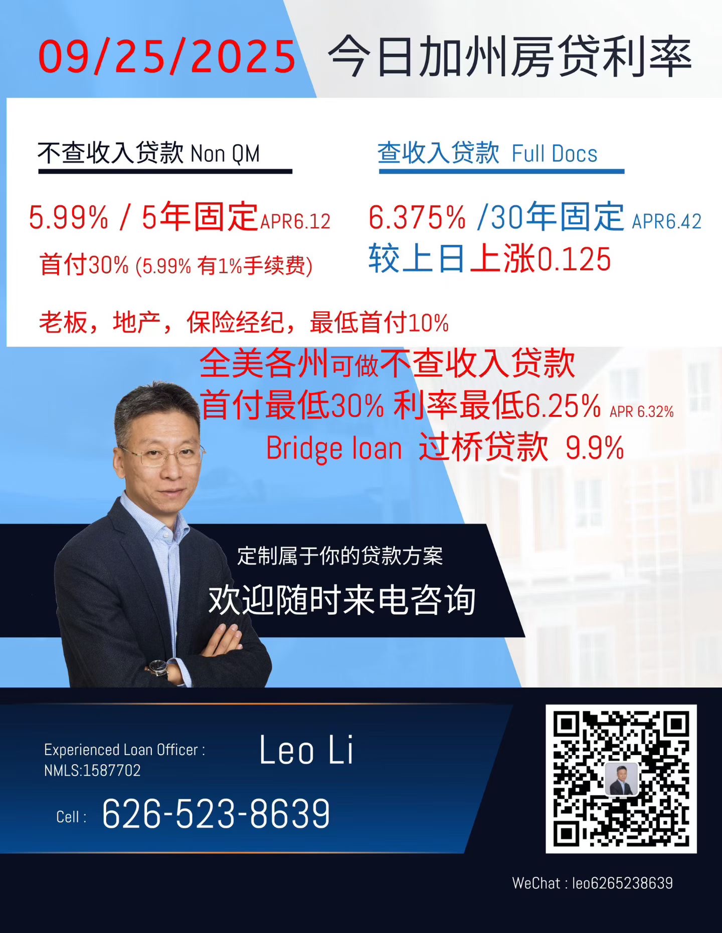 近期房贷利率在美联储宣布降息0.25%后略有回升,回到降息前水平,投资和自住房购房者需谨慎把握。对于加州购房者,现在可申请不查收入贷款,利率5.99%起,APR 6.12%,首付仅需30%,信用分数720以上即可。请注意,除了利率,最低1%的手续费也需计算在内。利率+费用的综合报价才是真正的成本参考。把握当前时机,合理安排重贷,省钱又稳妥。