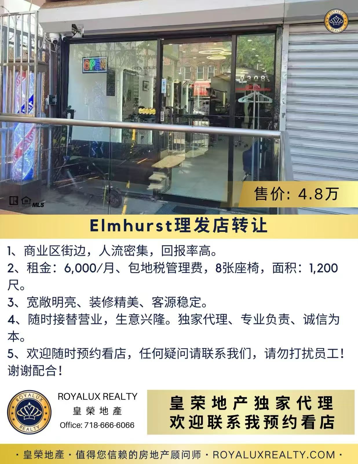 皇荣地产独家代理,Elmhurst艾姆赫斯特理发店转让,售价$48,000。店铺位于商业区街边,人流密集,客源稳定,回报率高。店铺面积约1,200平方尺,设8张座椅,租金$6,000/月(含地税及管理费),装修精美,宽敞明亮。随时接手营业,无需额外装修或设备投资,即可开始盈利。专业独家代理,服务诚信可靠,欢迎预约看店或咨询更多信息。📞 Darren 谢 516-820-8688