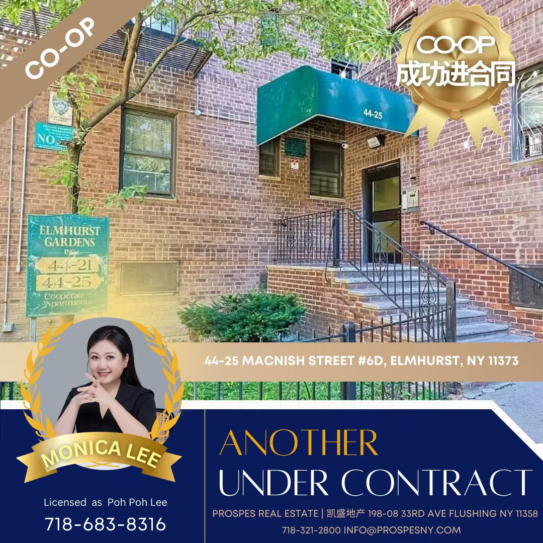 凯盛地产捷报频传!我们的优秀经纪Monica成功独家代理位于Elmhurst的Coop顺利进合同,再次体现了凯盛地产团队的专业实力和服务质量。此次交易不仅是一次房产买卖的成功,更是卖家对我们团队信任与合作的体现。