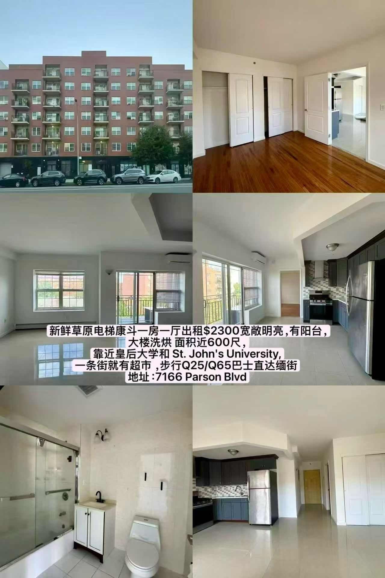 6) 新鲜草原电梯康斗一房一厅出租$2300宽敞明亮,有阳台,大楼洗净,面积近600尺,靠近皇后大学和 St. John's University,一条街就有超市 ,步行Q25/Q65巴士直达缅街
