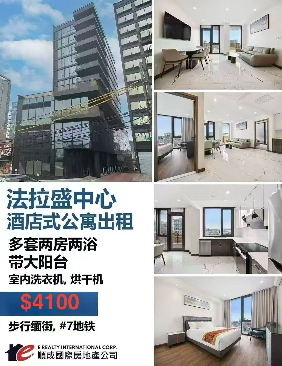 1)🌷全新 法拉盛黄金地段 王子街多套全新酒店式电梯公寓2 房2 浴帶大廳陽台出租!室内洗烘,带家具$4100起租