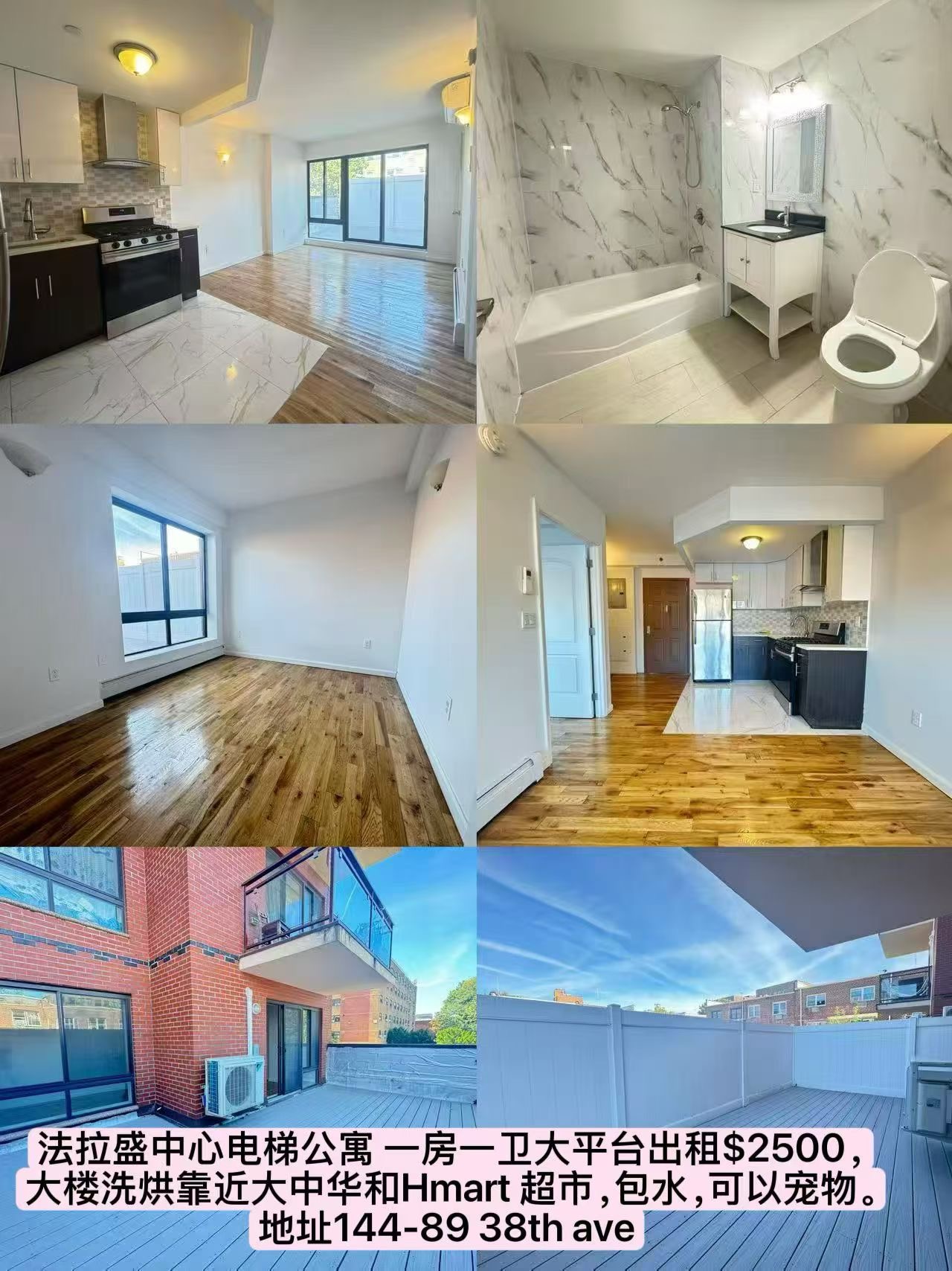 4)法拉盛中心电梯公寓 一房一卫大平台出租$2500,大楼洗烘 靠近大中华和Hmart 超市,包水,可以宠物。