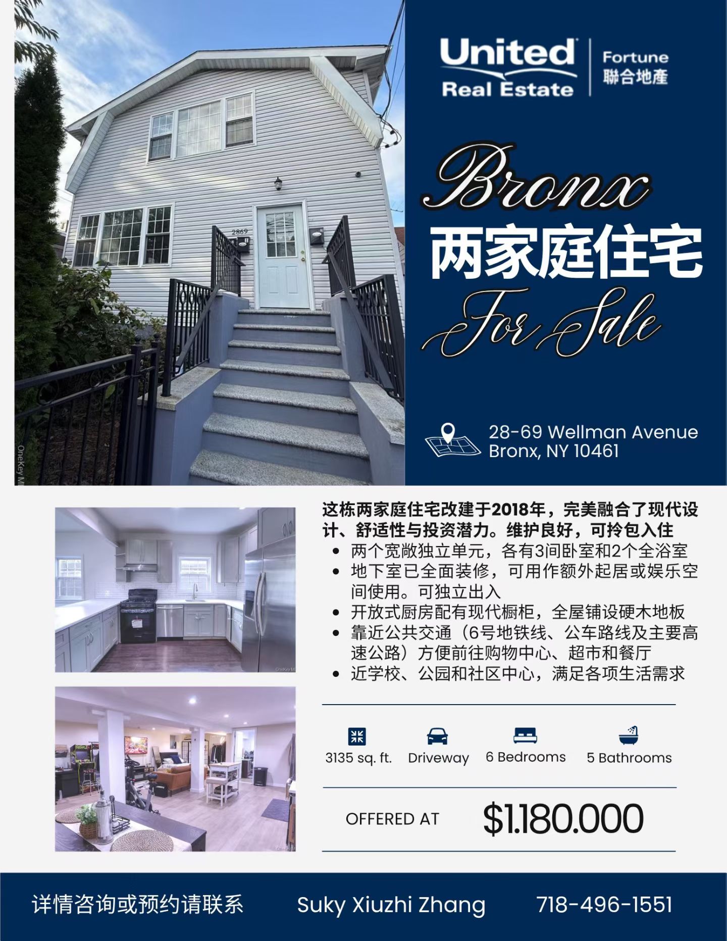 布朗士两家庭出售🏡 Bronx两家庭住宅✨💰售价:$1,180,000